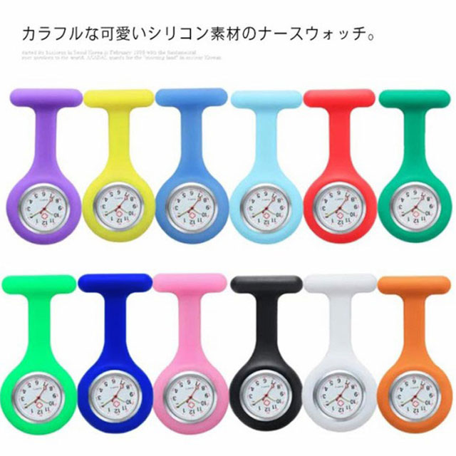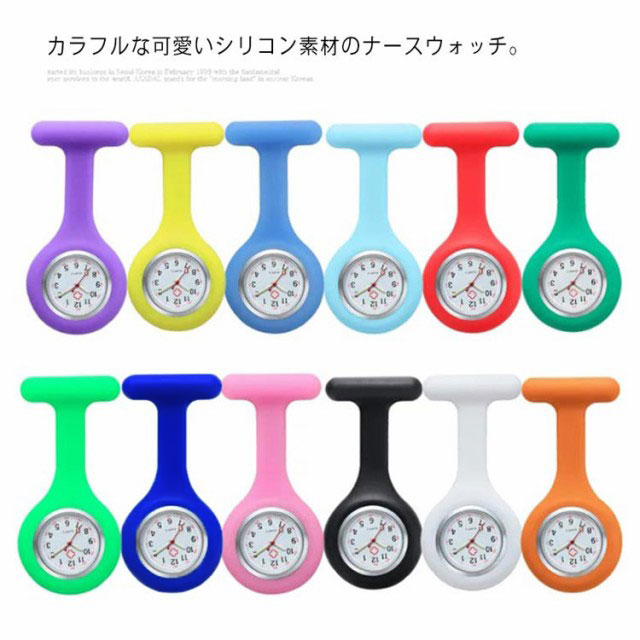 | カラフルな可愛いシリコン素材のナースウォッチ。 文字盤がさかさまになっているのでバイタルを取る時に便利です。 柔らかいシリコン素材で、傷つく心配なく気軽く扱います。 裏のクリップでしっかりと挟んでくれるので勢いよくビョーンとしても外れない。 携帯電話が見れない時も、災害時にも使いやすい。 | |