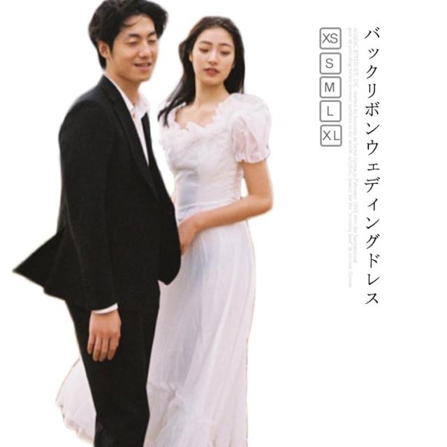 ウエディングドレス 二次会 ウエディング ロングドレス 可愛い プリーツ 背中リボン バックリボン フォトウェディング ドレス リゾートウェディング セパレートドレス ロング丈 ドレス