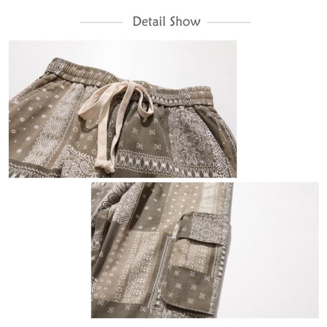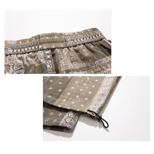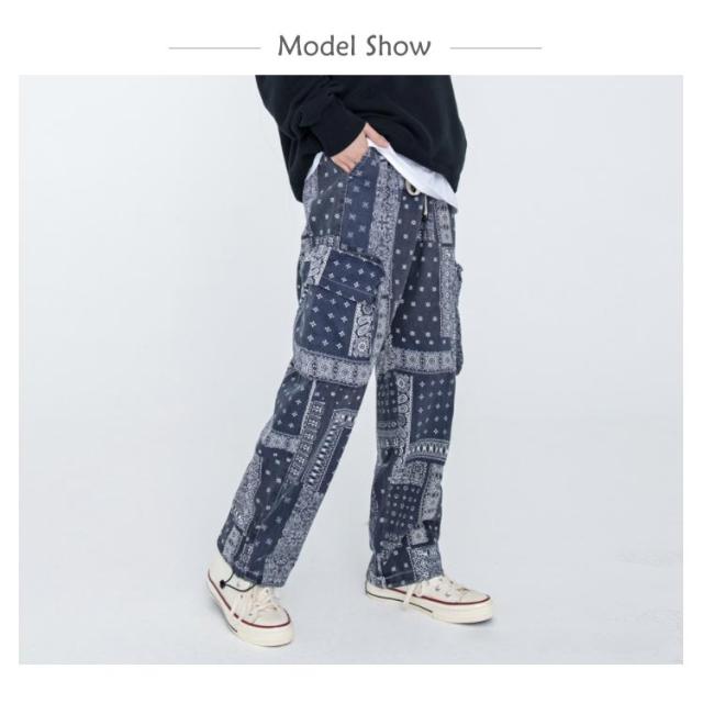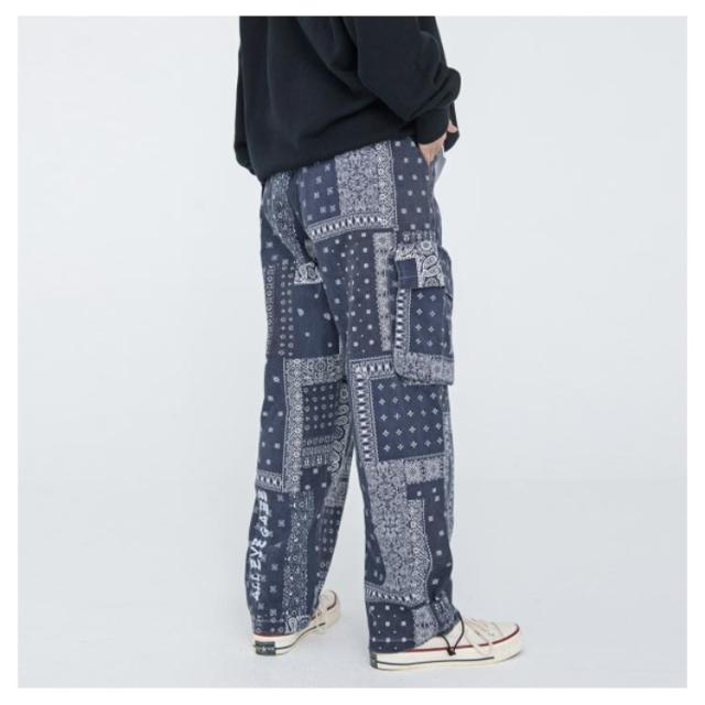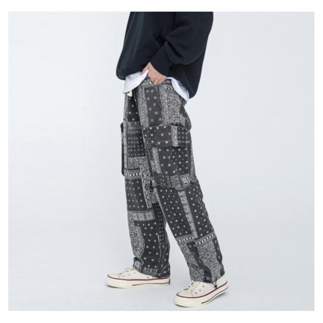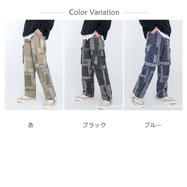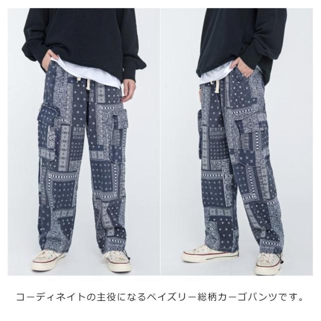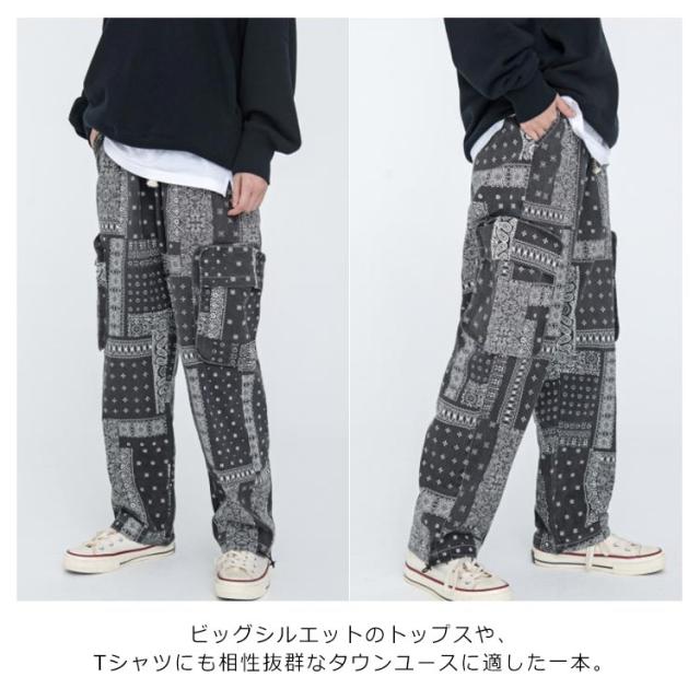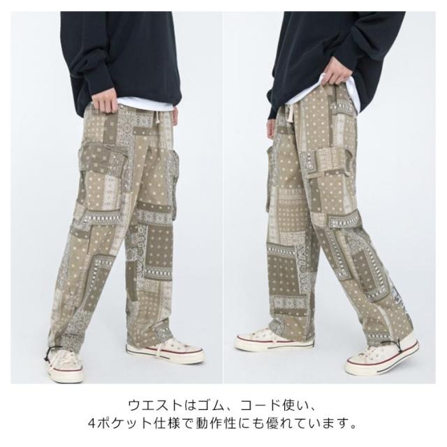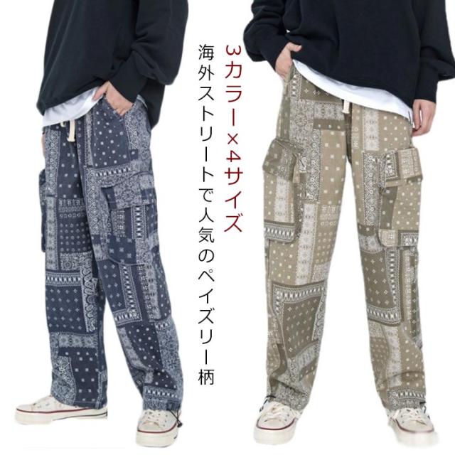 カーゴ メンズ ワークパンツ 春秋 バンダナ ワイドパンツ 柄 サイドポケット ロングパンツ ウエストゴム ペイズリー カーゴパンツ 柄パンツ 総柄 チノパン メンズ ミリタリー ペイズリー柄パンツ