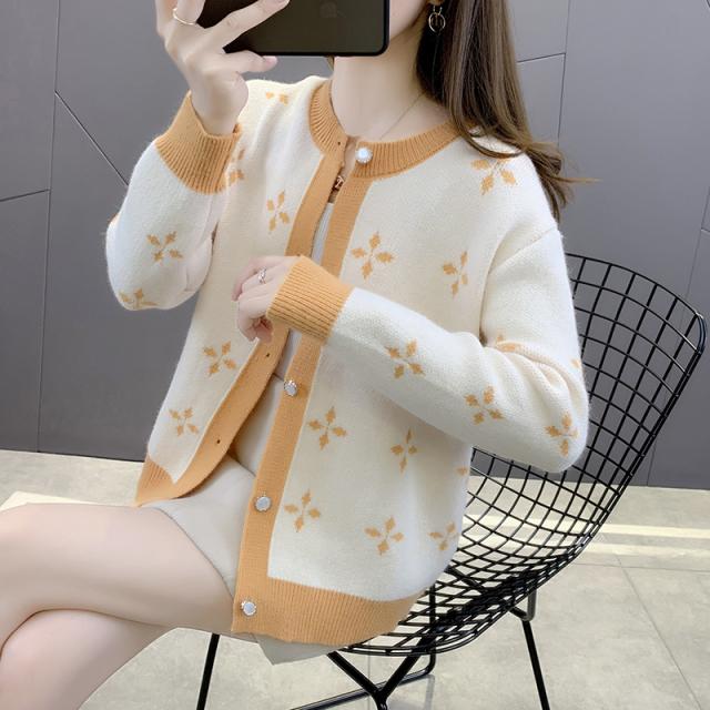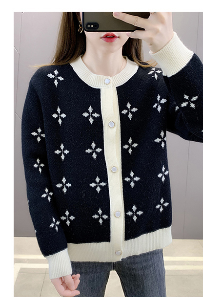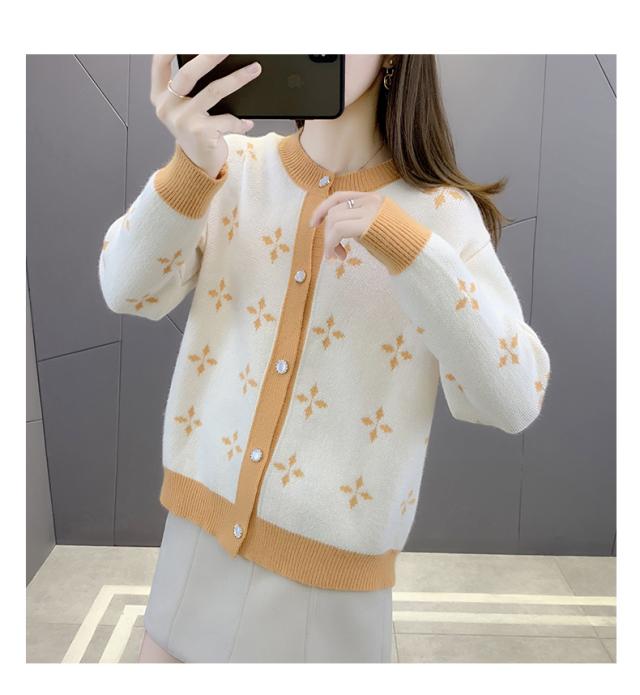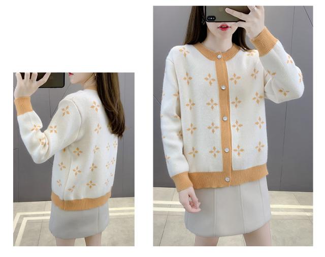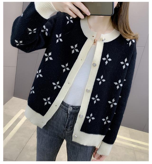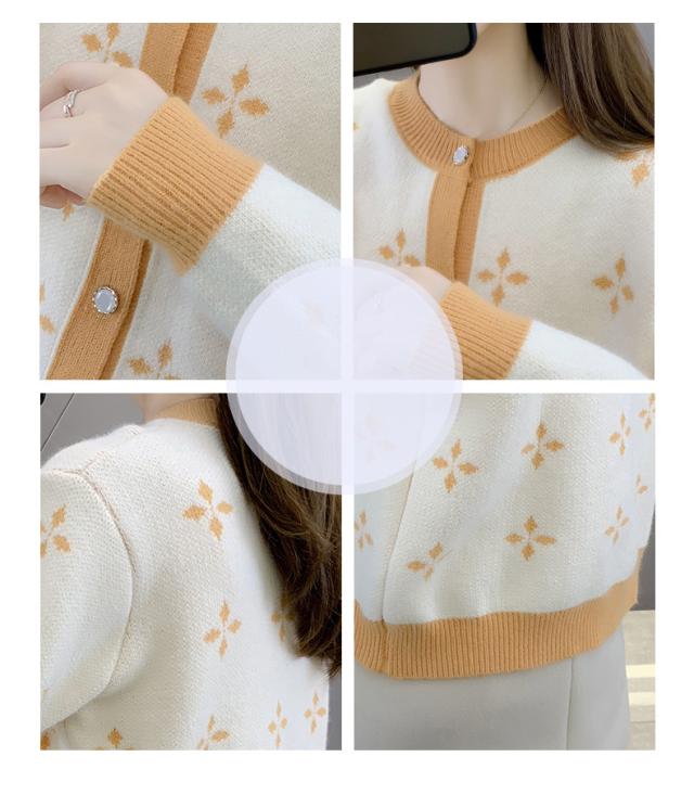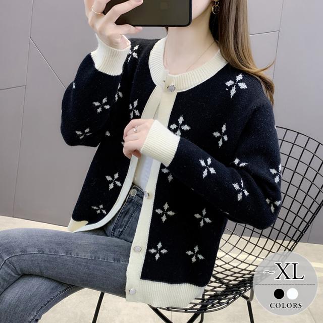 カーディガン トップス 長袖 襟無し 総柄 柄 ボタン 大人可愛い ツートンカラー きれいめ シック ホワイト ブラック ミセス シンプル ナチュラル