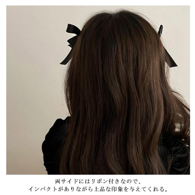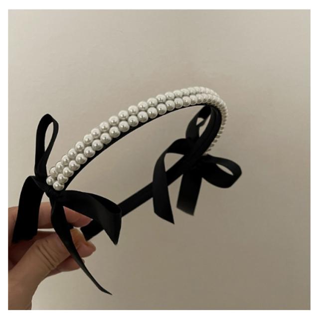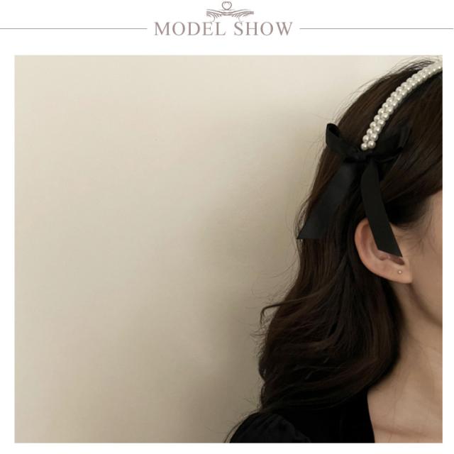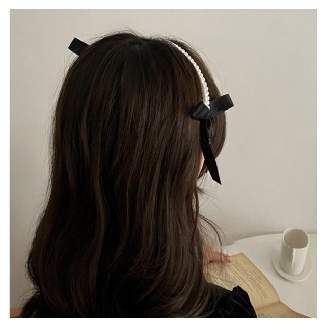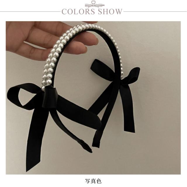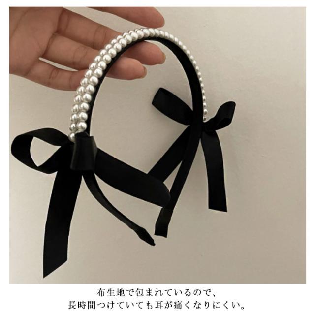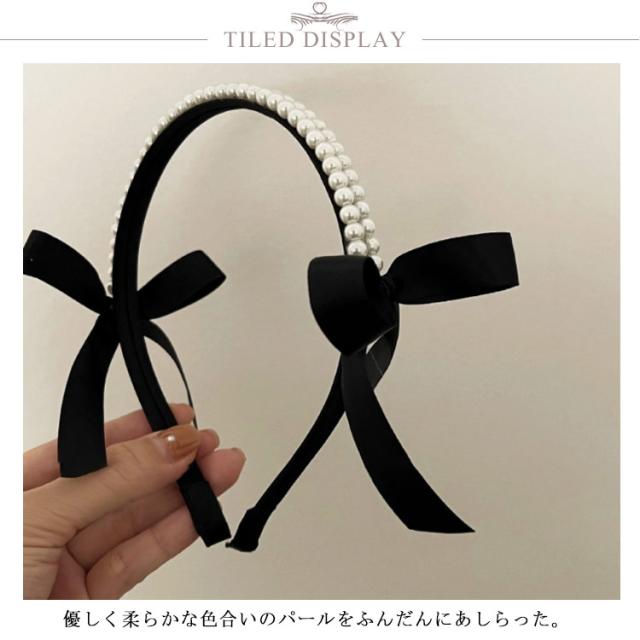 ヴィンテージ風 リボン パール 細め カチューシャ ヘアアクセサリー エレガント 大人っぽい シンプル かわいい 黒 高級感 細カチューシャ レディース