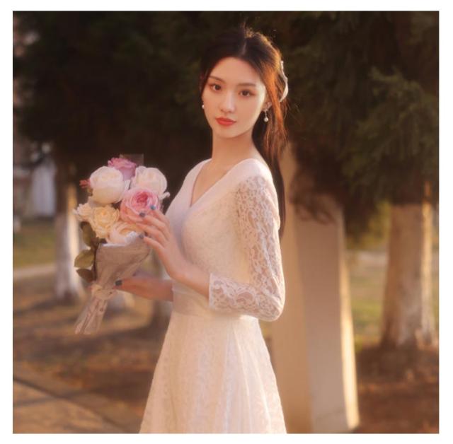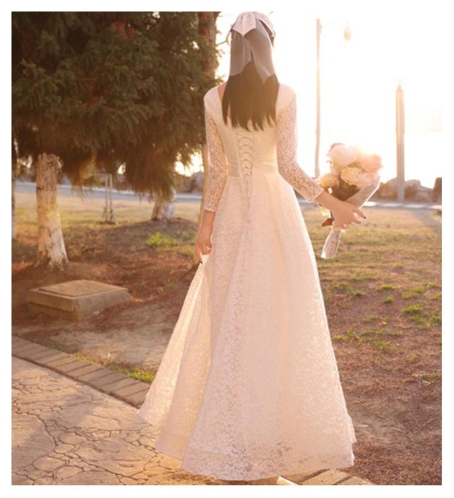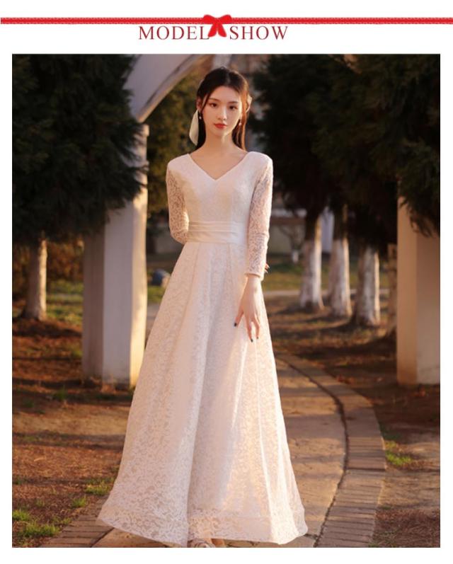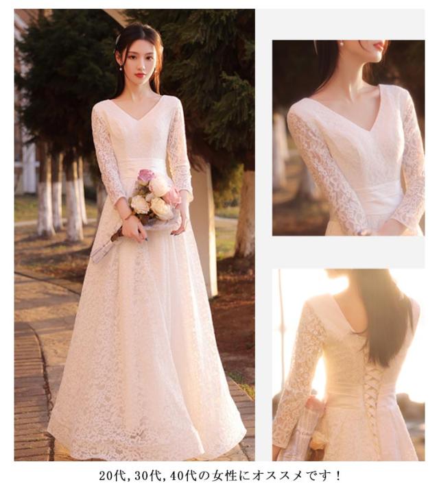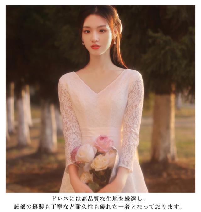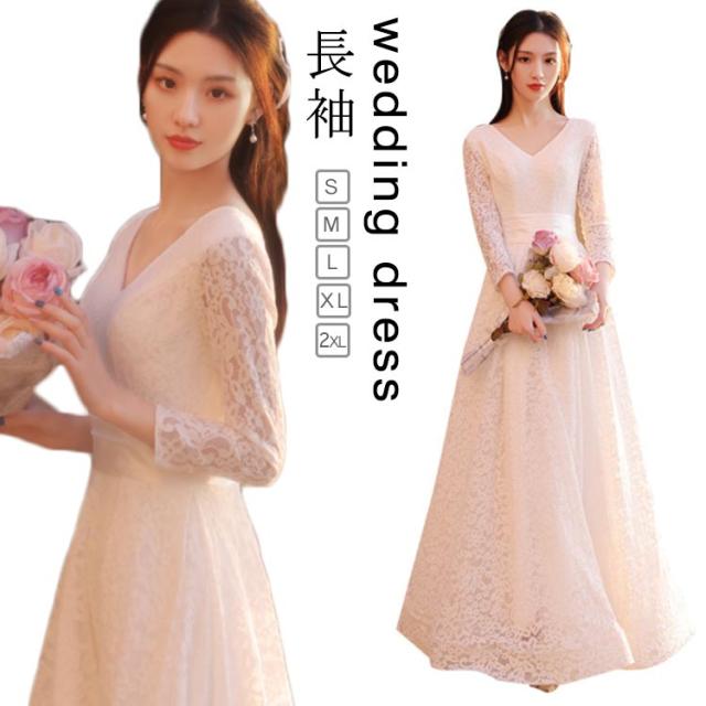 ウェディングドレス ロングドレス ウェディング ウエディング パーティードレス 長袖 Vネック 結婚式 ワンピース 海外 挙式 ホワイト 白 ドレス