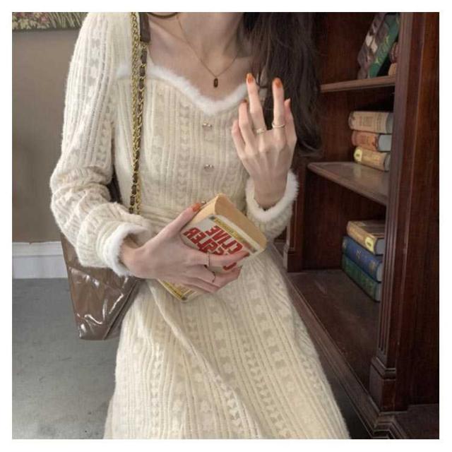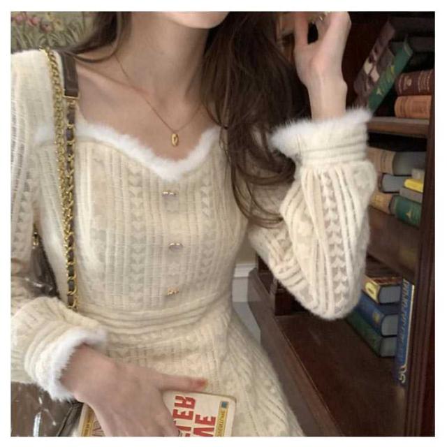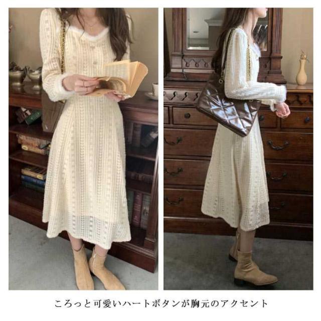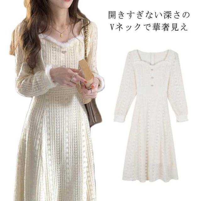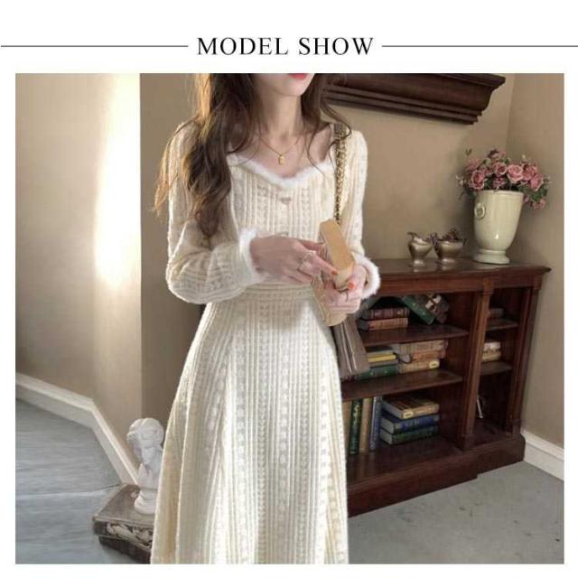 ワンピース ニットワンピース レースワンピース ロング丈 ワンピース 長袖 オシャレ 高級感 秋冬 きれいめ 裏起毛 暖かい フランス風 防寒 豪華感 デート 彼女 プレゼント ギフト クリスマス