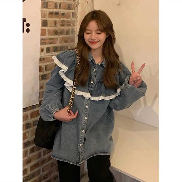 デニムシャツ レディース ブラウス 長袖シャツ ロング丈 切り替え ストライプ フリル メッシュ トップス 羽織 ゆったり カジュアル 秋物 冬物 着痩せ S M L XL お洒落 送料無料