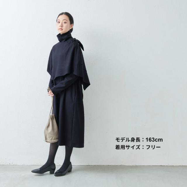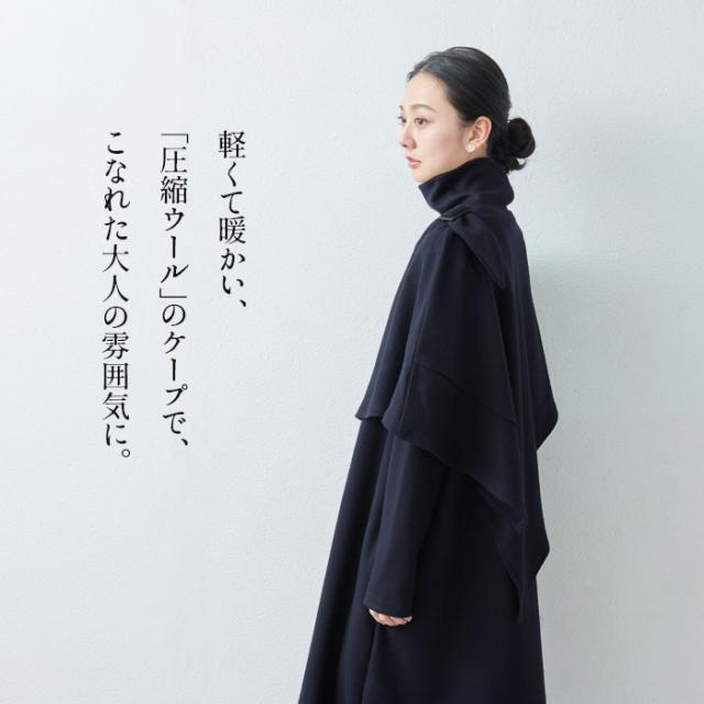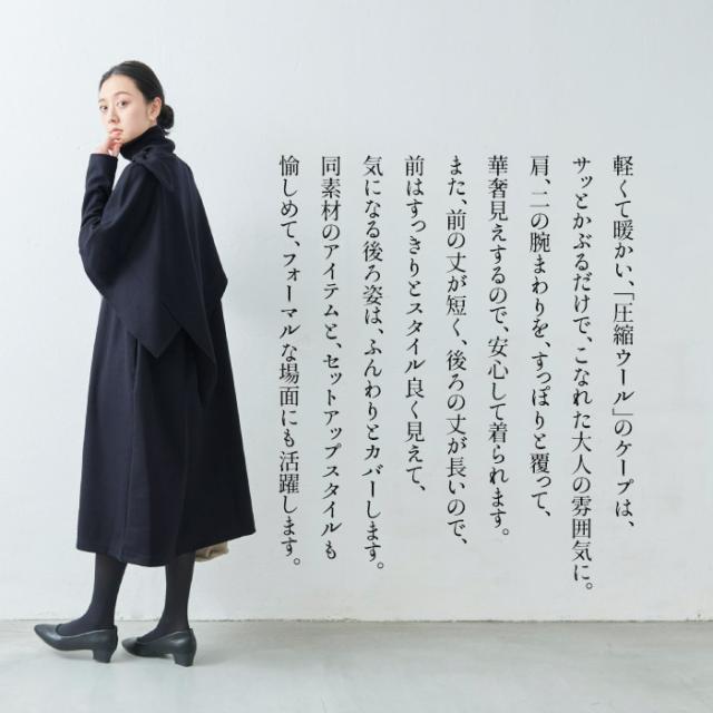 特徴 軽くて暖かい、「圧縮ウール」のケープは、サッとかぶるだけで、こなれた大人の雰囲気に。肩、二の腕まわりを、すっぽりと覆って、華奢見えするので、安心して着られます。また、前の丈が短く、後ろの丈が長いので、前はすっきりとスタイル良く見えて、気になる後ろ姿は、ふんわりとカバーします。同素材のアイテムと、セットアップスタイルも愉しめて、フォーマルな場面にも活躍します。