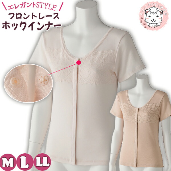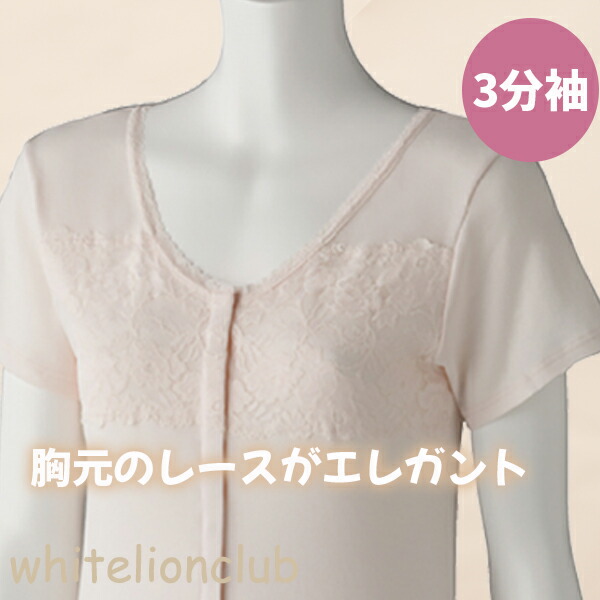 フロントレース 3分袖 ホックインナー 綿100% 前開き 半袖 M/L/LL | 婦人用 プラスチックホック式 三分袖 肌着 下着 インナー シャツ 入院 介護 介護施設