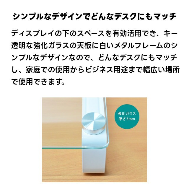 透明な強化ガラスの天板に白いメタルフレームのシンプルなデザインなので、どんなデスクにもマッチし、家庭での使用からビジネス用途まで幅広い場所で使用できます。