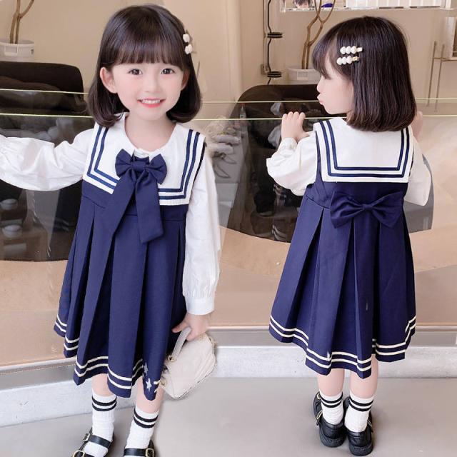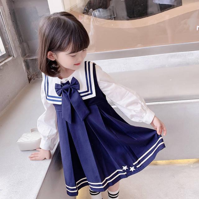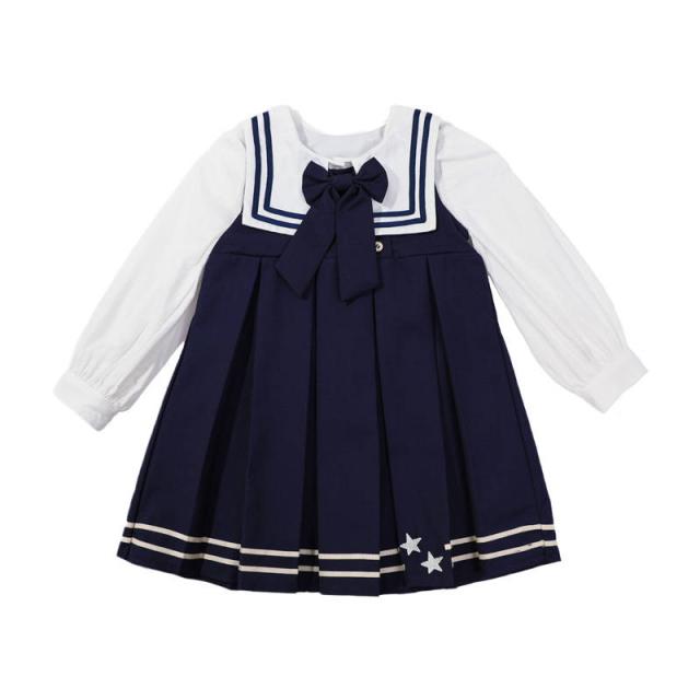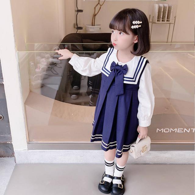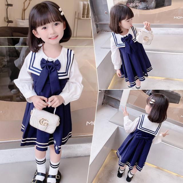 ワンピース 女の子 シャツ ドレス 2点セット 子供 キッズ 長袖 制服 子ども服 子供ドレス おしゃれ 可愛い 学院風 海軍風 入学式 卒業式 結婚式 普段着 3〜8歳