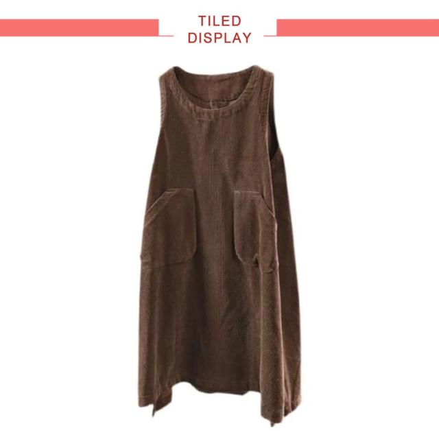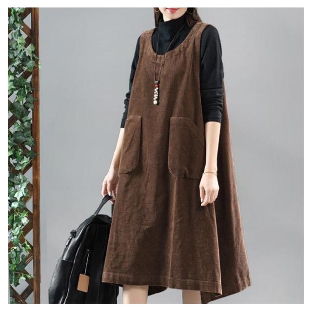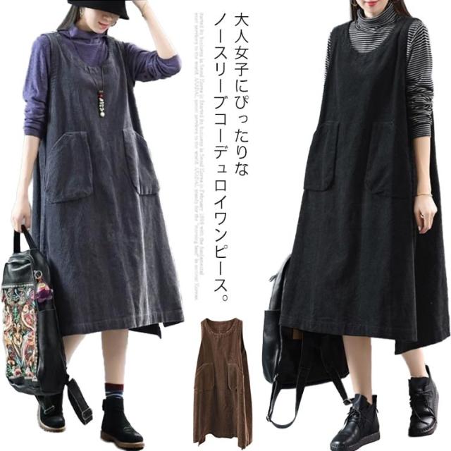 ワンピース ノースリーブ コーデュロイワンピース サロペット ワンピ クルーネック ポケットつき ミモレ丈 Aライン サイドスリット 大きいサイズ おしゃれ ゆったり 大人かわいい ナチュラル 体型カバー 秋冬 ワンピース 通勤 お出かけ
