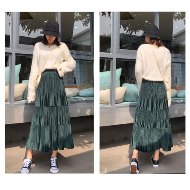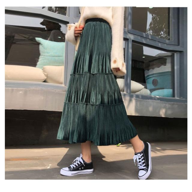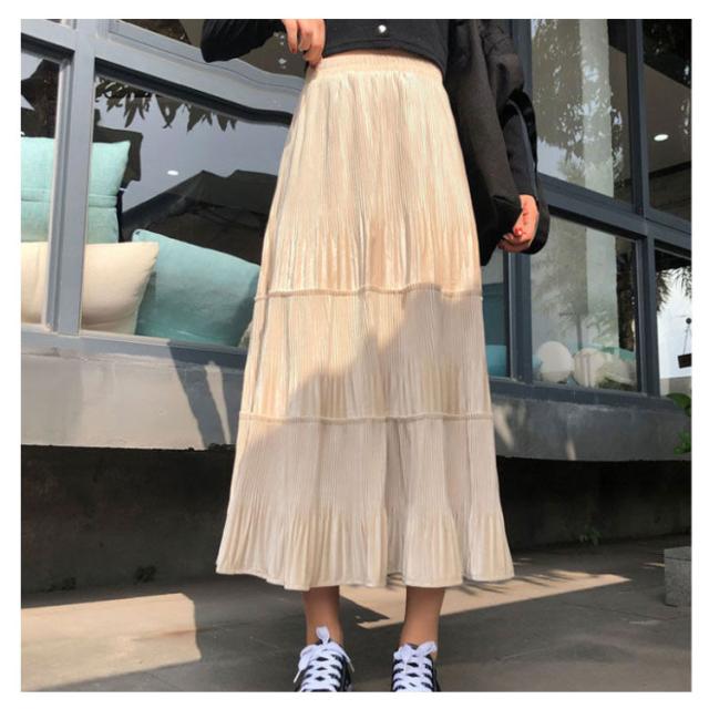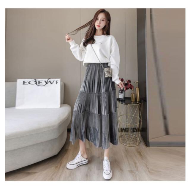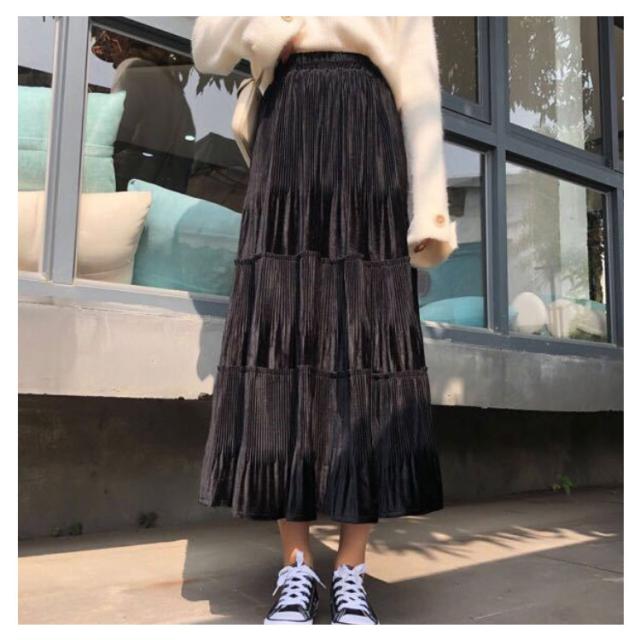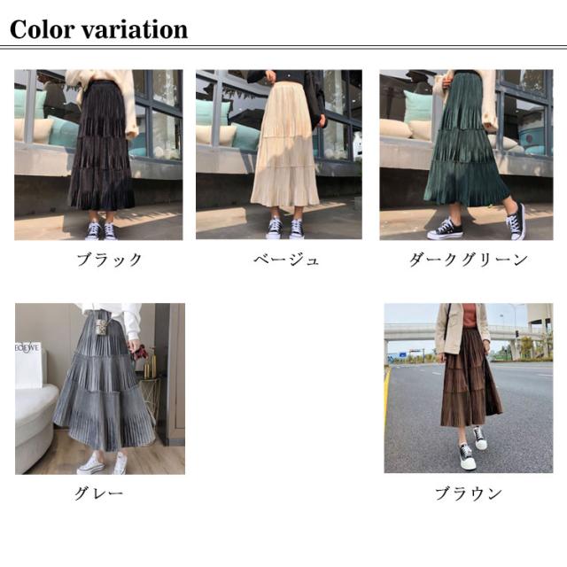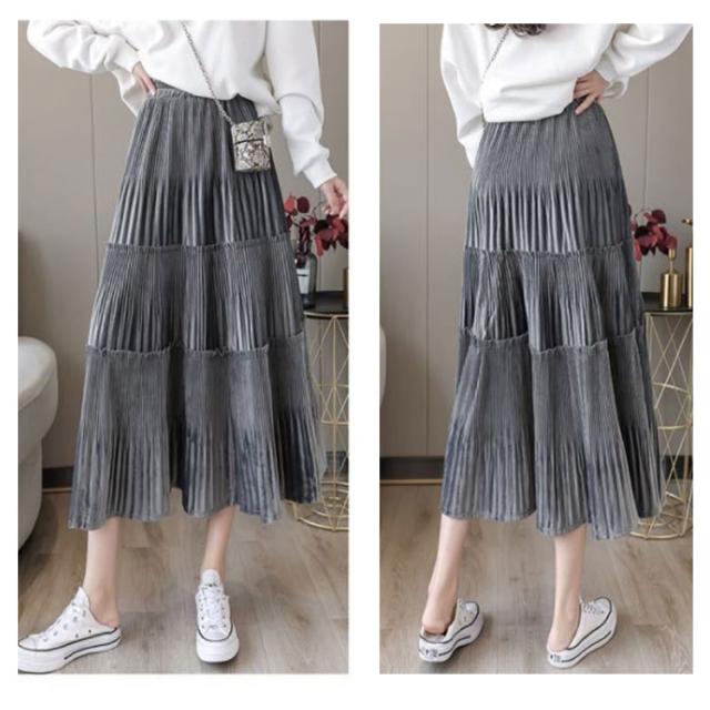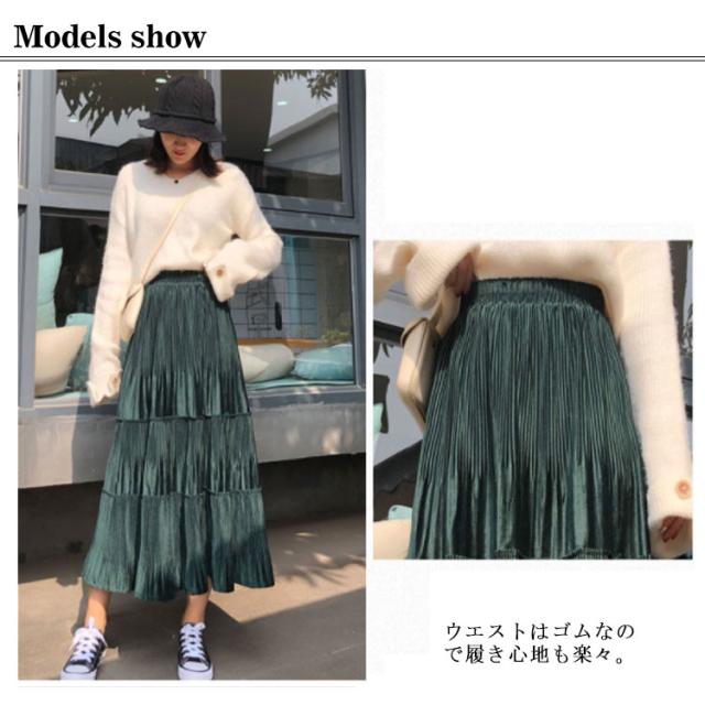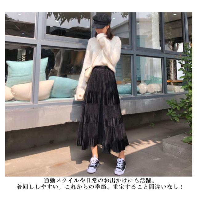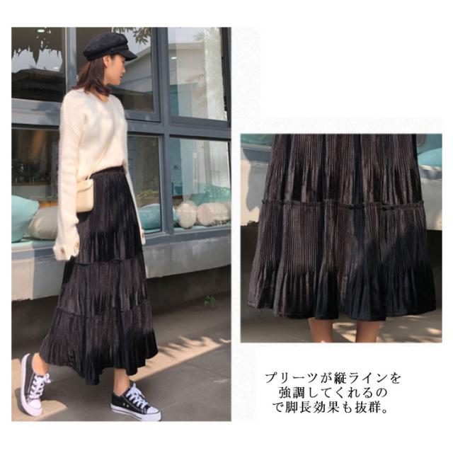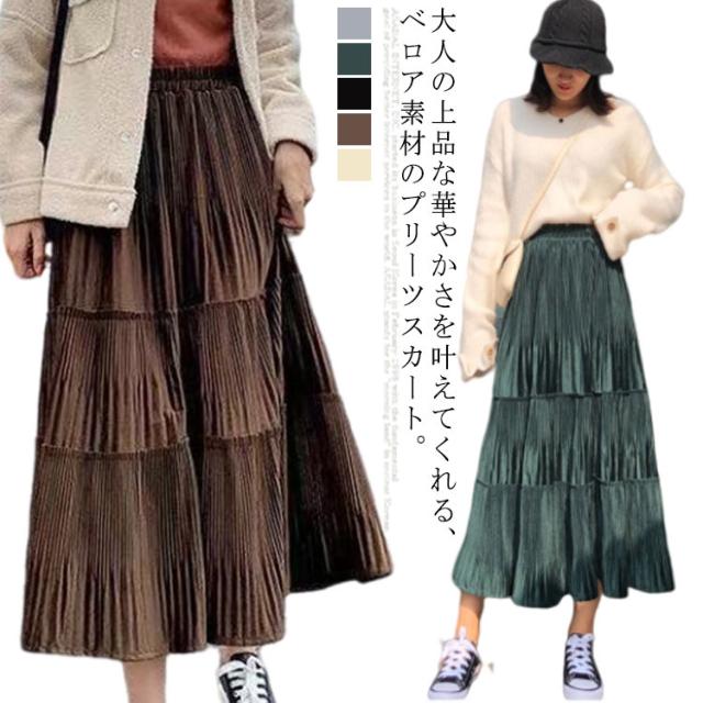 スカート レディース プリーツスカート ベロアスカート ロングスカート マキシスカート ベルベット スカート プリーツ 秋服 冬服 フレアスカート ウエストゴム ハイウエスト 切替 ふんわり 着痩せ 可愛い 送料無料