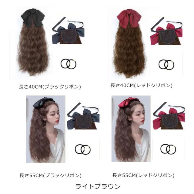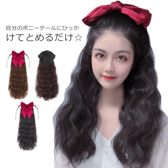 自然 ロング ウイッグ ポニーテール ガーリー レディース 黒 かつら ポニーテールウィッグ つけ毛 付け毛 カール ウェーブ リボン付き ツインテール クリスマス ワンタッチ 茶色 耐熱 エクステ かわいい コスプレ ダンス 結婚式 ウィッグ
