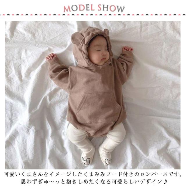 | 【くまみみフードが可愛いデザイン】 可愛いくまさんをイメージしたくまみみフード付きのロンパースです。 思わずぎゅ〜っと抱きしめたくなる可愛らしいデザイン♪ 赤ちゃんの可愛さを引き立ててくれる、とってもキュートなデザインです。 【お肌に優しい&心地良い肌触り♪】 敏感な赤ちゃんのお肌に優しい素材のロンパースです。 大人の何倍も汗をかく赤ちゃんにとって、コットン素材は最適です♪ 【フード付きであたたかい】 くまみみフードを被れば、防寒対策としても◎ お出掛けの時や、おやすみタイムもフードをかぶれば赤ちゃんを寒さから守ってくれます。 【お着替え&オムツ替え楽々】 スナップボタン仕様で、赤ちゃんに負担なし! | |