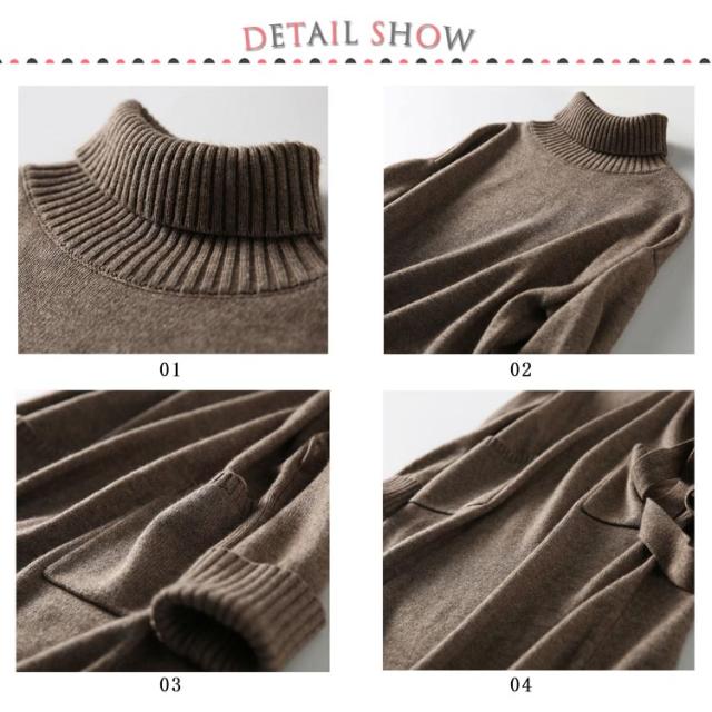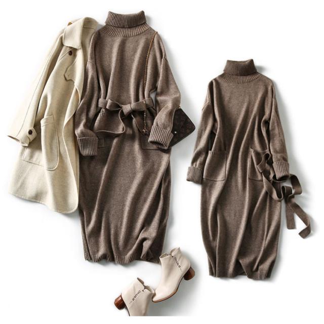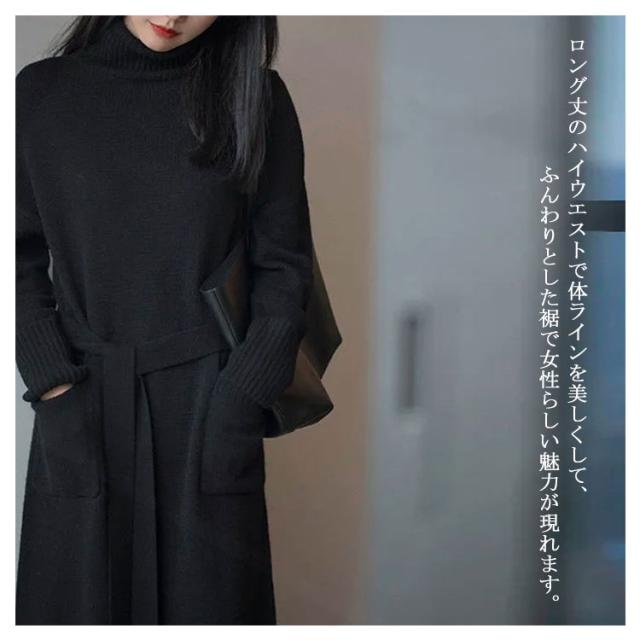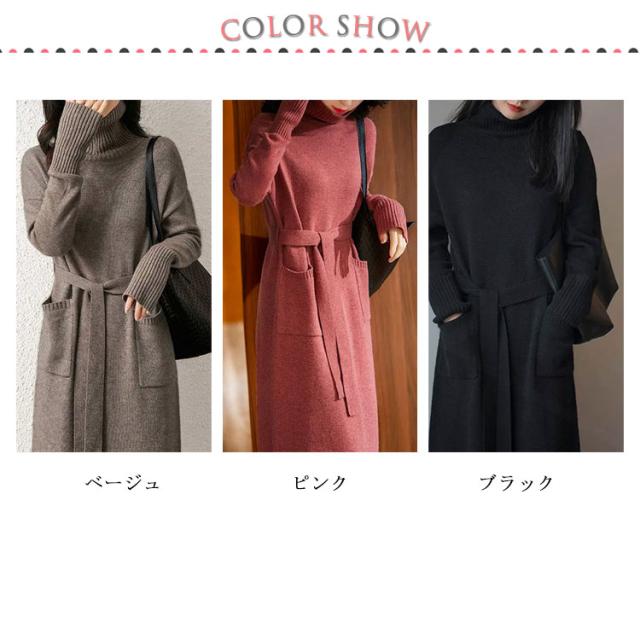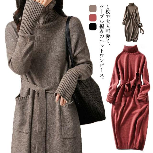 ニットワンピース タートルネック ニット ロングワンピース ワンピース ケーブル編み 秋冬 長袖 ベルト飾り レディース 着痩せ 小顔 オフィス 大人 きれいめ おしゃれ あったか
