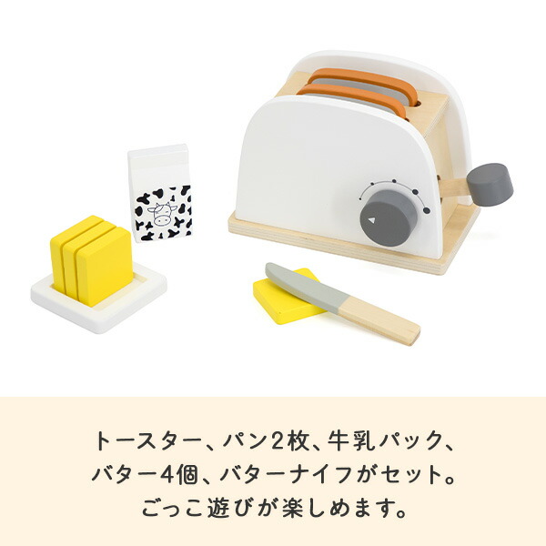 | 商品説明 | ●ニュートラルなデザインが新しいベルギー生まれのTRYCO(トライコ) ● レバーを押すとパンが飛び出す楽しいしかけがついたトースターセット ●パン、トースター、牛乳パック、バター、バターナイフがセットになり、ごっこ遊びが楽しめます ●セット内容:パン2枚、トースター、牛乳パック、バター4個、バターナイフ |