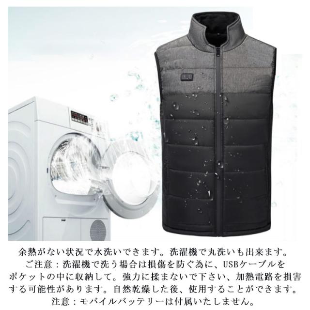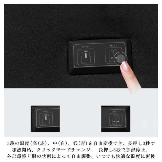 | 【製品について】: *【3段温度コントロール+二つ区域独自調温】:3段の温度(高(赤)、中(白)、低(青)を自由変換でき、長押し3秒で加熱開始、クリックモードチェンジ、 長押し3秒で加熱停止、外部環境と服の状態によって自由調整、いつでも快適な温度に変換 *【便利さ】:外出したり、仕事したり、バッテリーをポケットに入れて、USB接続ケーブルを差し込むだけで、服を加熱することができます。1分間で、すぐ暖かくなり、凍えている体を速やかに暖めます。 (※モバイルバッテリーは付属いたしません。) *【水洗いできる】:余熱がない状況で水洗いできます。洗濯機で丸洗いも出来ます。ご注意:洗濯機で洗う場合は損傷を防ぐ為に、USBケーブルをポケットの中に収納して。強力に揉まないで下さい、加熱電路を損害する可能性があります。自然乾燥した後、使用することができます。 注意:モバイルバッテリーは付属いたしません。 | |