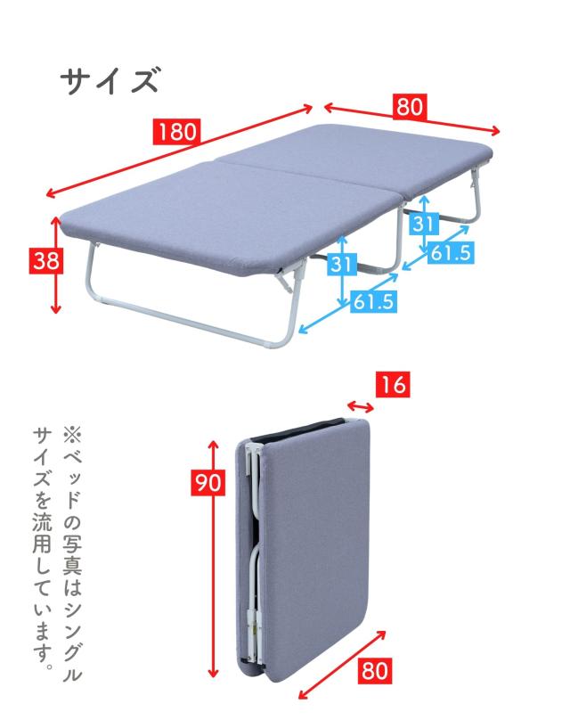 | 商品説明 | ●折りたたみベッドをよりシンプルに使いやすく見直した「パタントベッド」シリーズ ●部屋を広く使いたい方や、お子様におすすめなセミシングルショートサイズ ●平らで脚のはみ出しもなく、並べて使うことも可能(連結補助用の面テープバンド2本付属) ●薄型のウレタンマット入りのトッパー一体型なので、マットレスがなくてもそのまま布団を敷くだけで利用可能 ●掃除もしやすく収納ケースも入る脚長設計 ●ベッド下サイズ:幅61.5 高さ31cm ●立ちあがりやすい床面高さなので、布団からの寝起きが辛い方へもおすすめ ●たためば薄さ16cmに変形(※自立構造ではありません) ●静止耐荷重:200kg(保証値ではございません。) ※本製品は7000N(700kg相当)の荷重試験をクリアした商品です。当社では安全を考慮し、本商品は耐荷重200kgに設定しております。 ●折りたたみ時のサイズ:幅16 奥行80 高さ90cm |