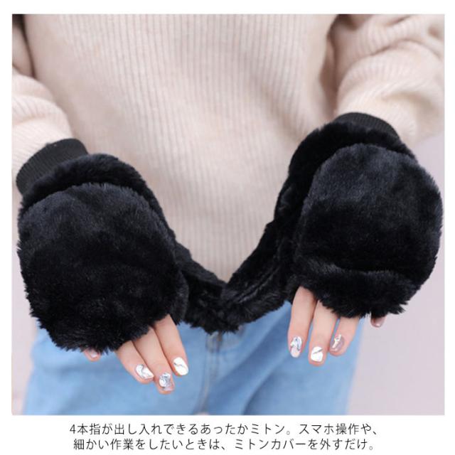 | ふわふわなミトンと指切りの2way手袋。 中もしっかりボアだから、ふんわり暖か! 4本指が出し入れできるあったかミトン。スマホ操作や、細かい作業をしたいときは、ミトンカバーを外すだけ。 女性らしい丸みのあるフォルムが可愛らしいデザイン。 手首も隙間なくフィットし、しっかり寒さをガードしてくれます。暖かさを逃さずっとポカポカ。 | |