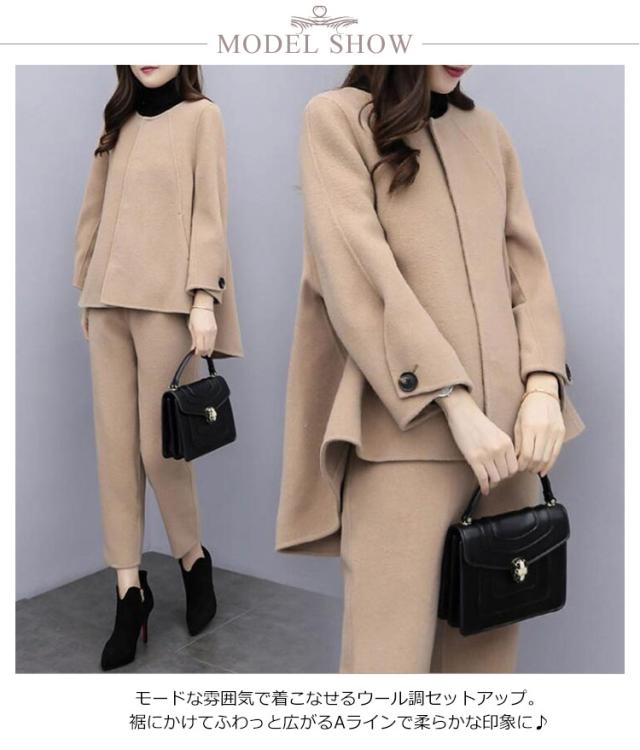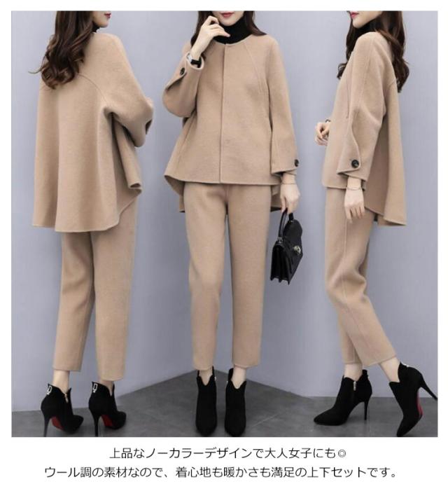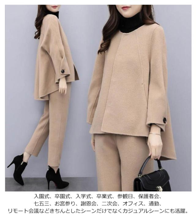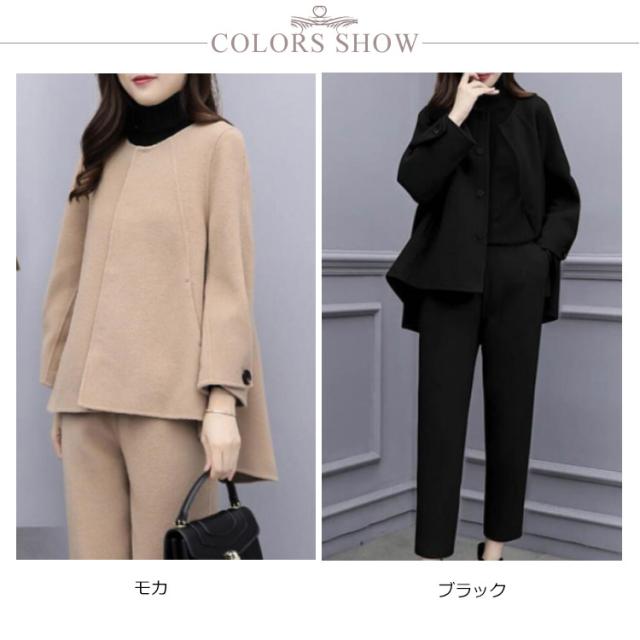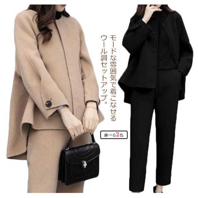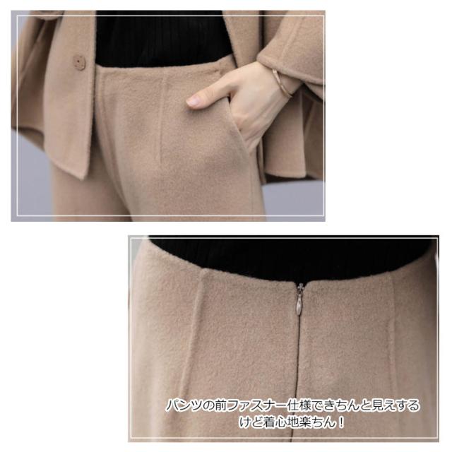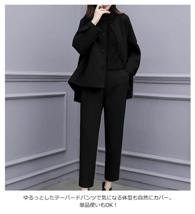 秋冬 ロングパンツ テーパードパンツ ノーカラージャケット スーツ 2点セット パンツスーツ 冠婚葬祭 セットアップ フォーマル 礼服 通勤 九分丈 ゆったり ウール調 コート 秋服 冬服 ビジネス 大きいサイズ オフィス 体型カバー 結婚式 入学式 卒業式 フォーマル