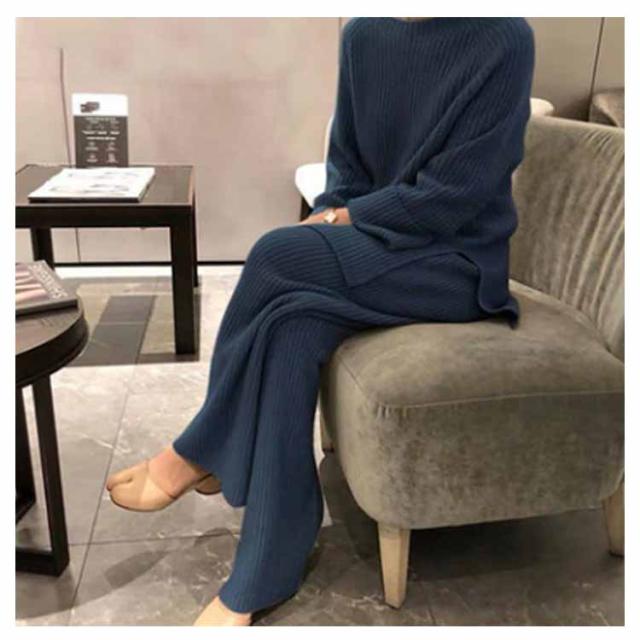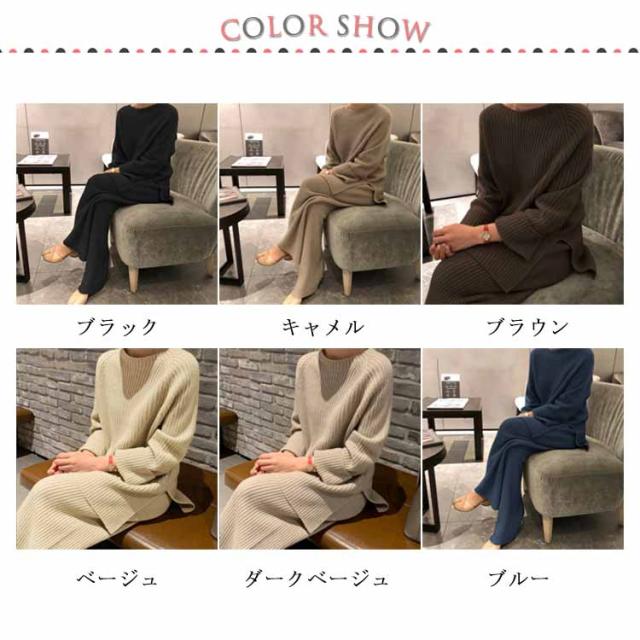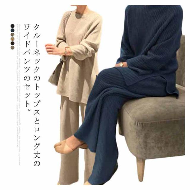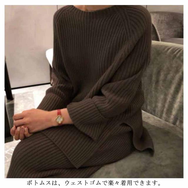 セットアップ レディース ニット 2点セット 長袖+ズボン パンツスーツ 秋冬 ニットパンツ ニットセーター 体型カバー サイドスリット クルーネック ロング丈 厚手 OL 通勤 お出かけ カジュアル ゆったり