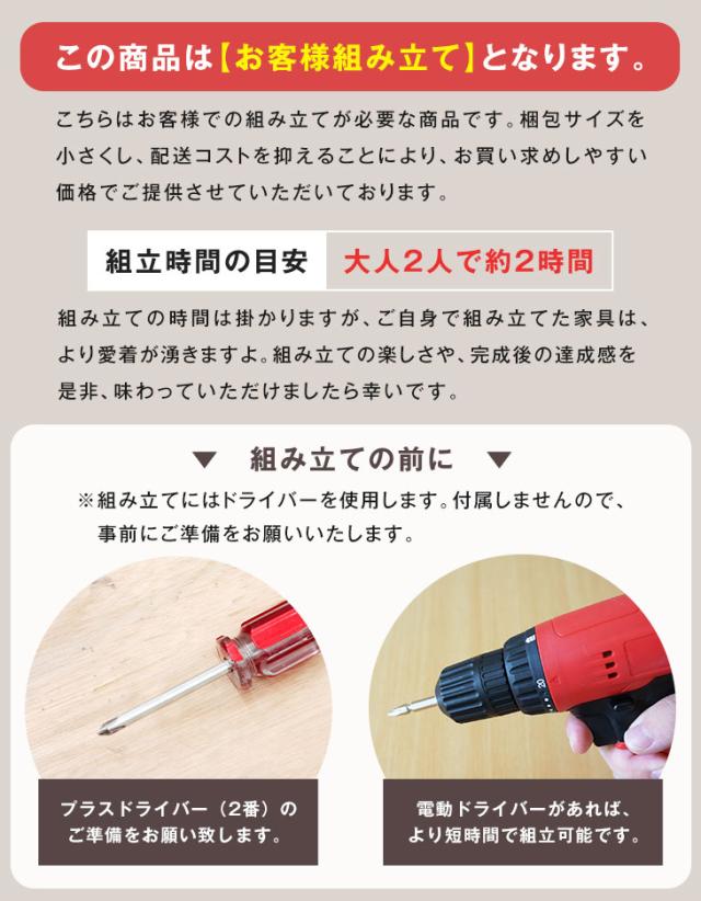 ※組立品となりますので、ドライバーをご用意していただく必要がございます。電動ドライバーがあるとスムーズに組み立てる事が出来ますが手回しドライバーでの組み立ても可能です。重量のある商品のため、男性または女性2人以上での組み立て作業をおすすめ致しております。