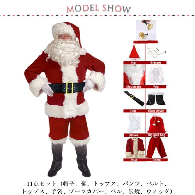 サンタクロス クリスマス 衣装 豪華 11点セット コスプレ メンズ レディース 男性用 ロング 帽子 ひげ パンツ ベルト メガネ 手袋 プレゼント 贈り物 男性 女性 大人用 ギフト クリスマスギフト
