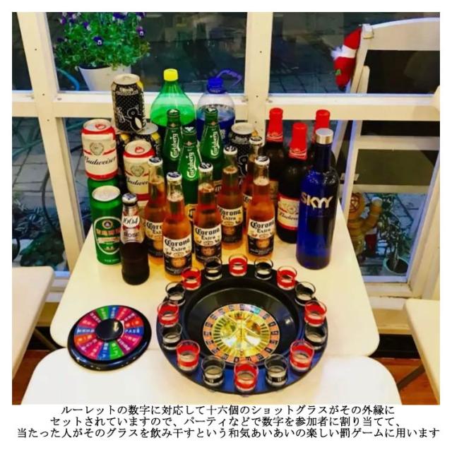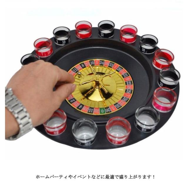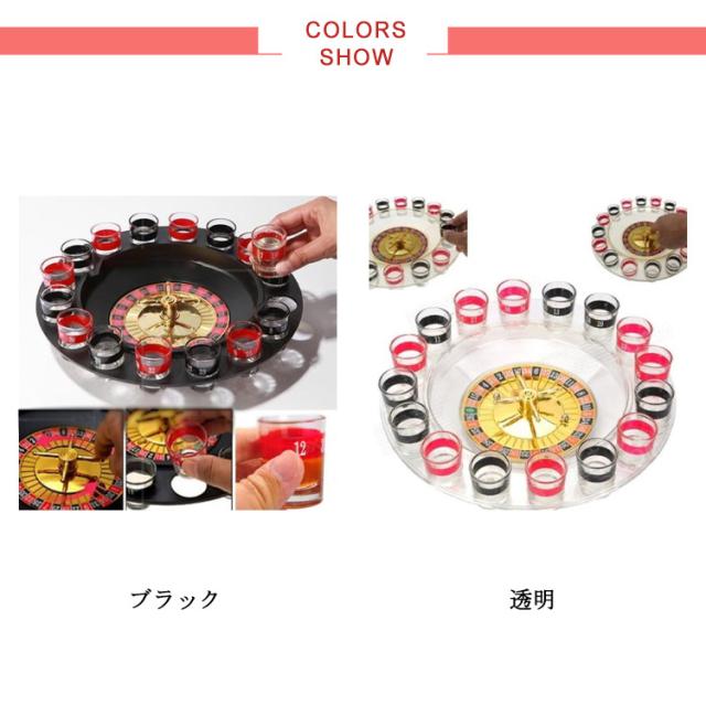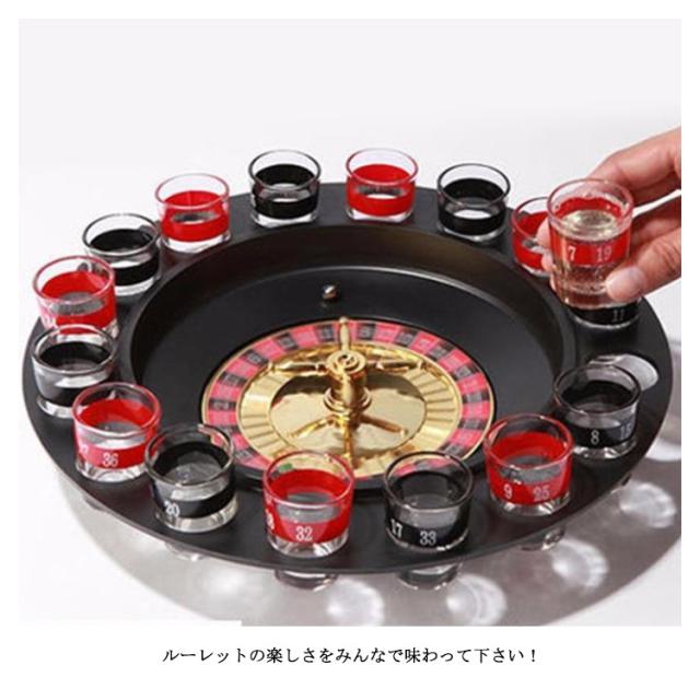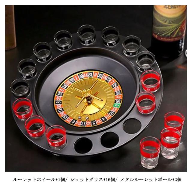 | サイズについての説明 | ルーレット:直径約29cm 高さ:約7cm ルーレットホイール*1個 ショットグラス*16個 メタルルーレットボール*2個 |