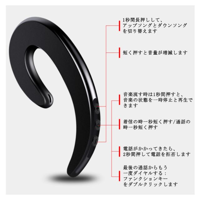 | サイズについての説明 | Bluetooth 5.0骨伝導イヤホン(片耳) Bluetooth距離:10メートル 電池容量:90mAH 充電時間:2時間うち 音楽再生時間:4-6時間 重量:120g 待機時間:48時間 |