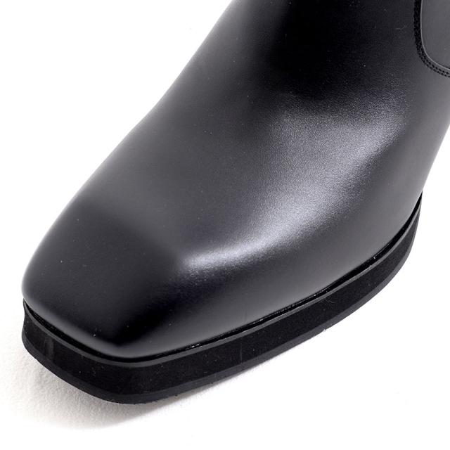 モードなスクエアトゥ、円柱ヒール、アッパーの切り替えデザインがポイント。