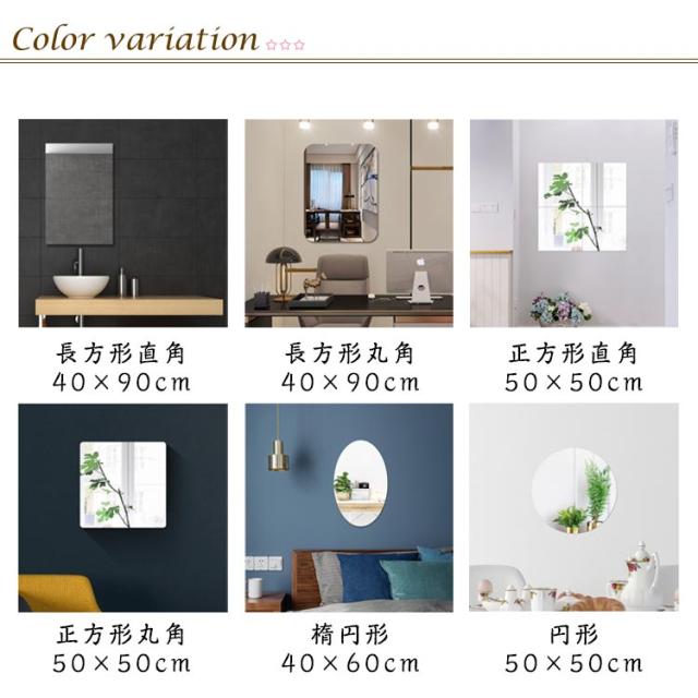 | 好きなところに簡単設置できるステッカーミラー。 非ガラス製なので、割れる心配がありません。 紙製クロスや砂壁、繊維壁、塗装面などデリケートな場所には貼らないでください。 タイプも選べて、場所によってサイズをご確認してください。 | |