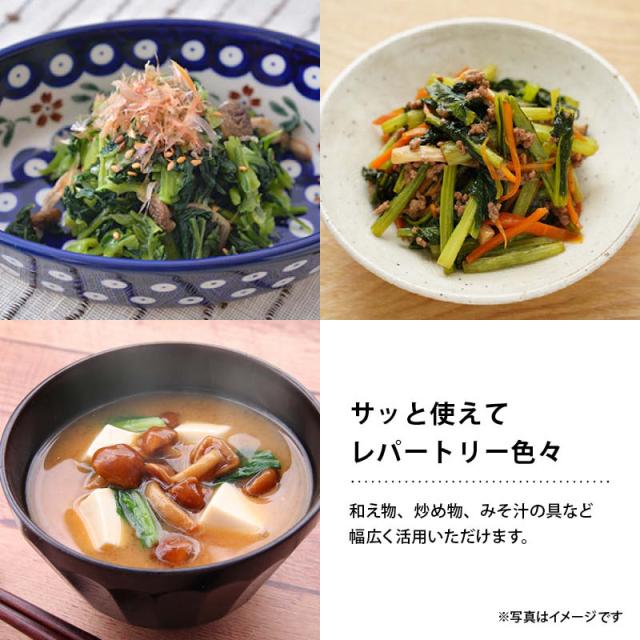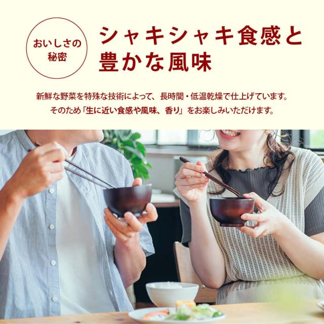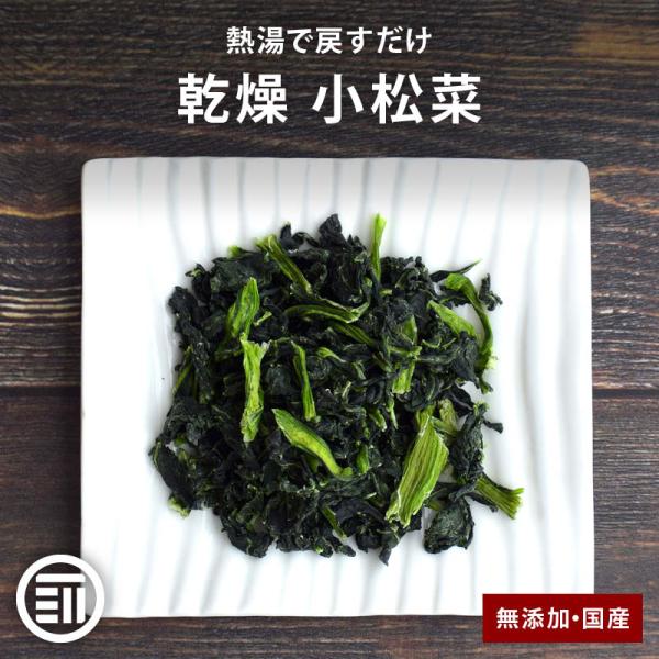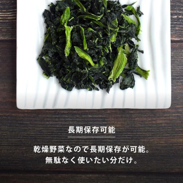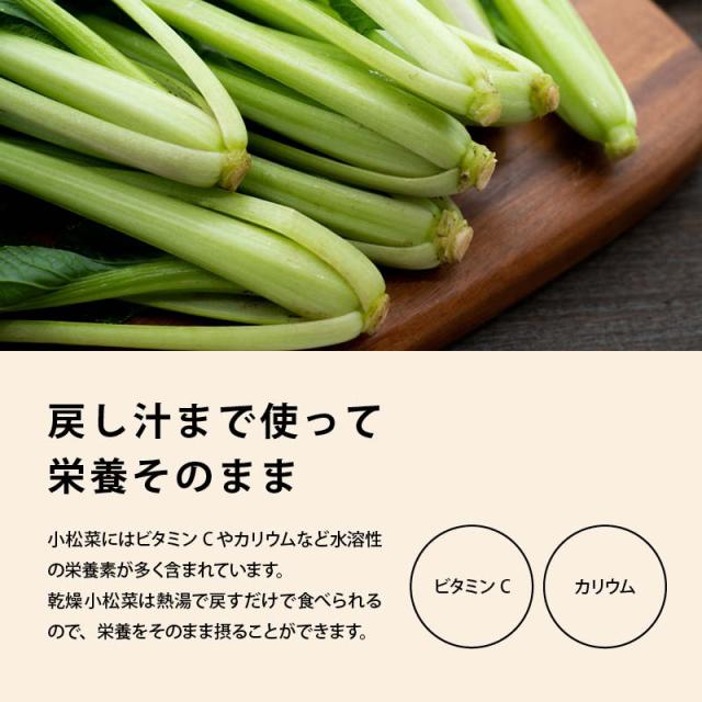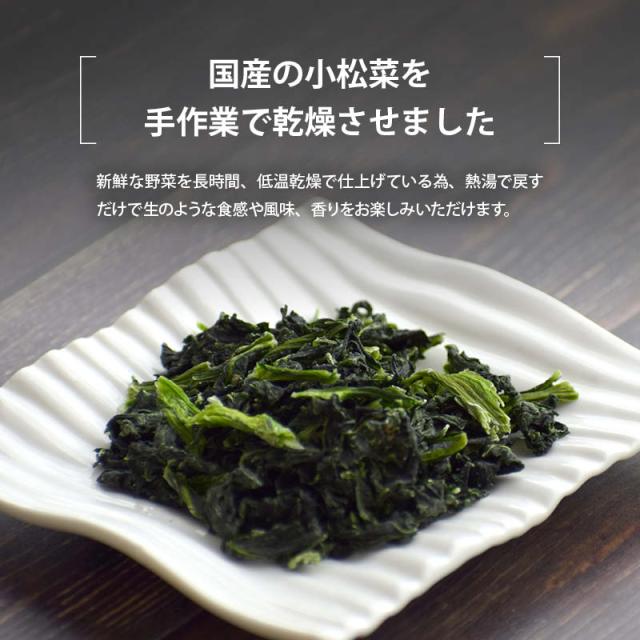 新鮮な小松菜を長時間、低温乾燥で仕上げている為、熱湯で戻すだけで生のような食感や風味、香りをお楽しみいただけます。