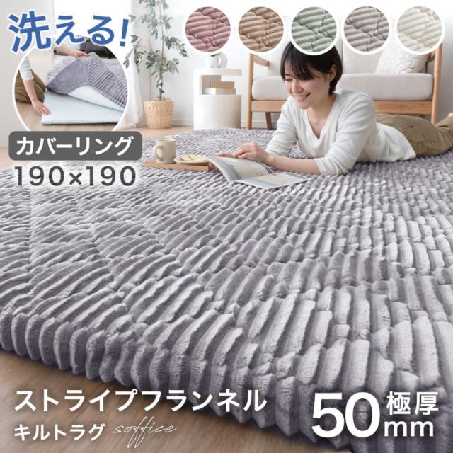 ラグ 2畳 厚手 洗える 極厚50mm 190×190 正方形 カバーリング ストライプ フランネル キルトラグ 洗える 床暖房対応 ラグ 厚手 ラグマット 2畳 極厚 滑り止め マット カーペット キルト ホットカーペット対応 高反発 絨毯