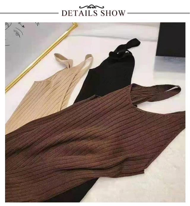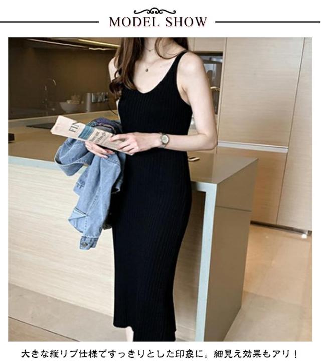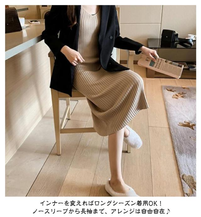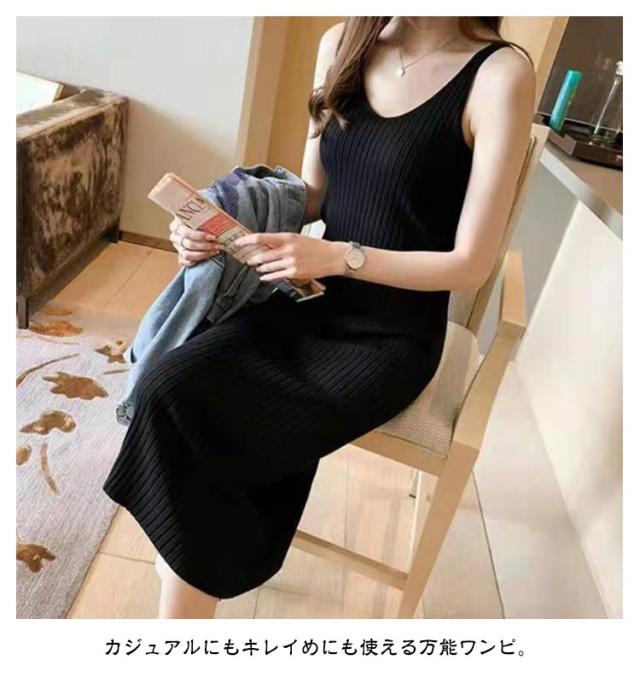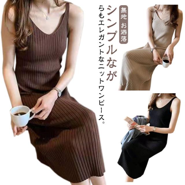 ニットワンピース キャミソールワンピース 送料無料 シンプル 送料無料 ロングワンピース レディース ノースリーブ Vネック 無地 ミモレワンピース リブ編み リブニット ストレッチ お洒落 キャミワンピ カジュアル インナー
