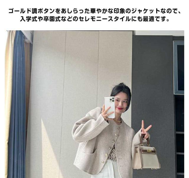 | ノーカラー仕様で、華やかに仕上がるツイードジャケットです。 コンパクトな着丈と、ミニマルなシルエットでながらトレンド感のあるデザイン。 スカート、ワンピース、パンツなど幅広いアイテムと合わせて着用できます。 ゴールド調ボタンをあしらった華やかな印象のジャケットなので、入学式や卒園式などのセレモニースタイルにも最適です。 テーパードパンツと合わせたきれいめスタイルから、デニムと合わせたカジュアルスタイルまで着回しが利くアイテム。 お出かけから卒業式・卒園式・入学式・入園式などのセレモニーまで大活躍させられます。 | |
