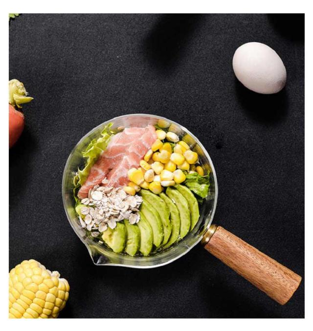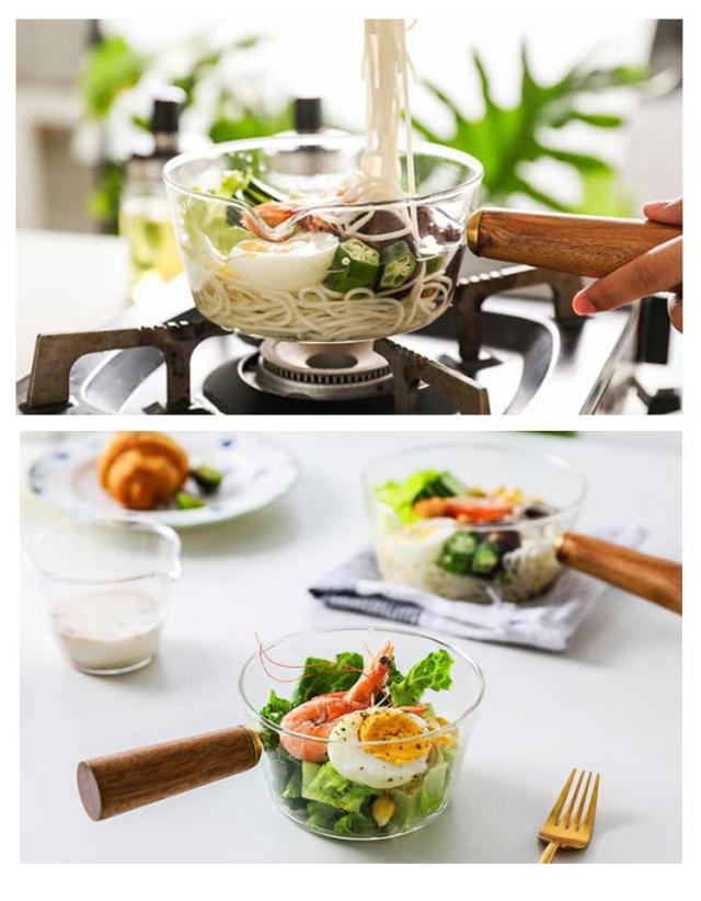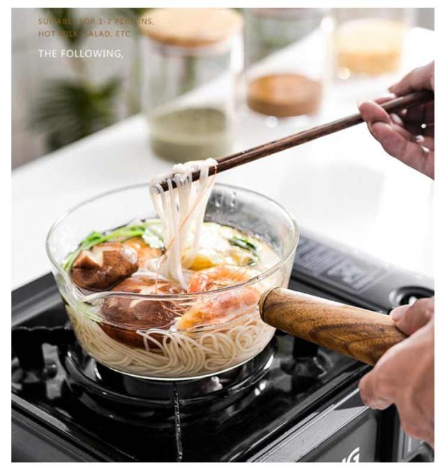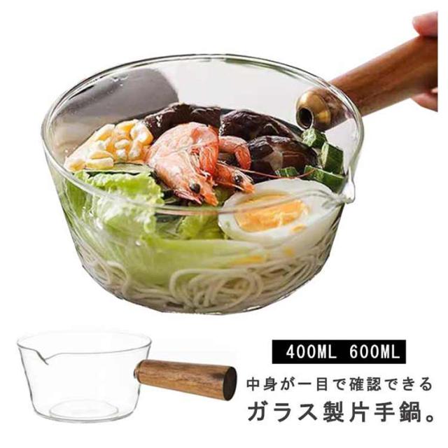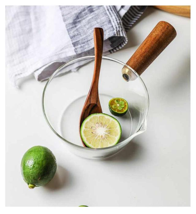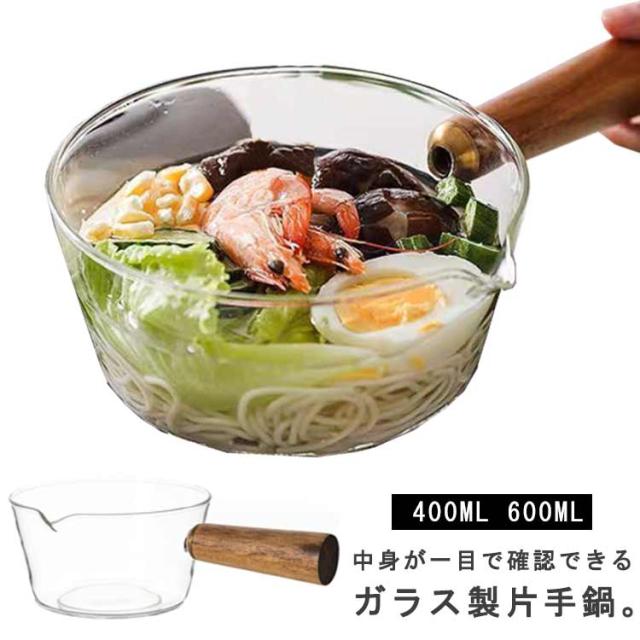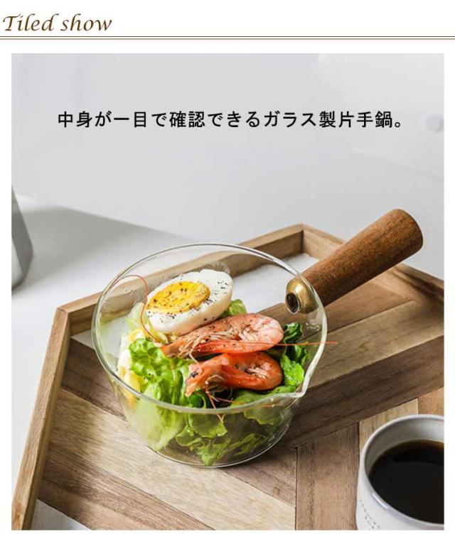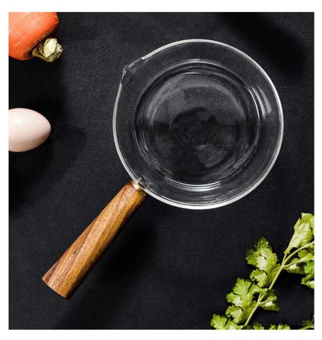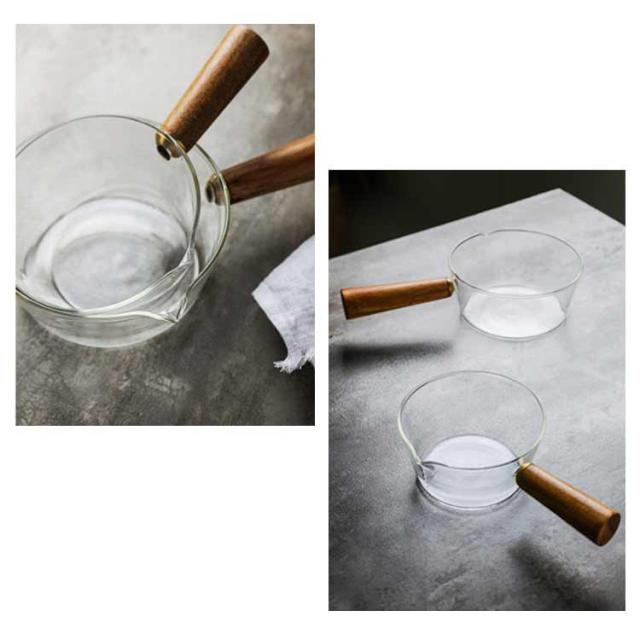 スープパン 離乳食 木製ハンドル付き 耐熱ガラス ディップ皿 ソースパン ガラス鍋 ガラス多機能皿 クリア 万能鍋 ガス火対応 ミニパン 片手鍋 透明 グラスパン 卓上鍋 北欧風 V字型注ぎ口 送料無料 小鍋 ミルクパン 小型