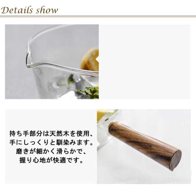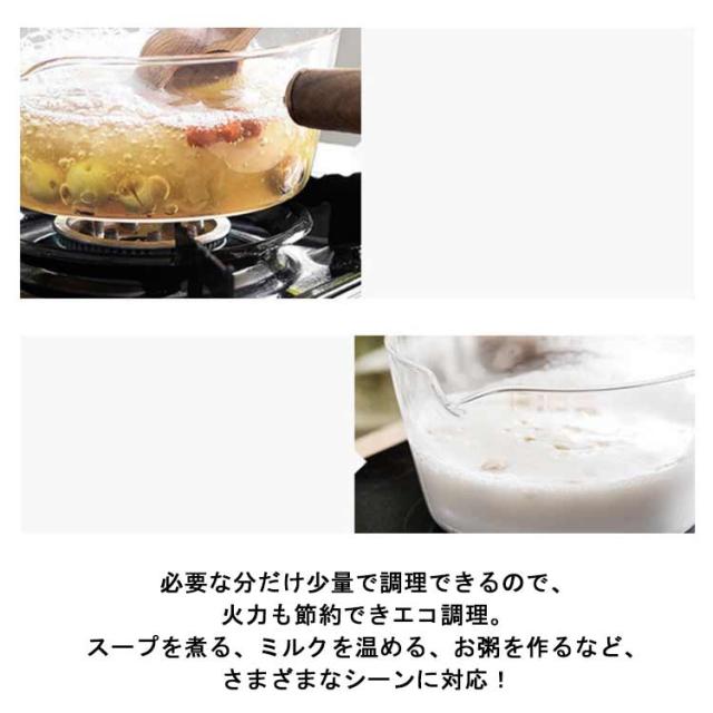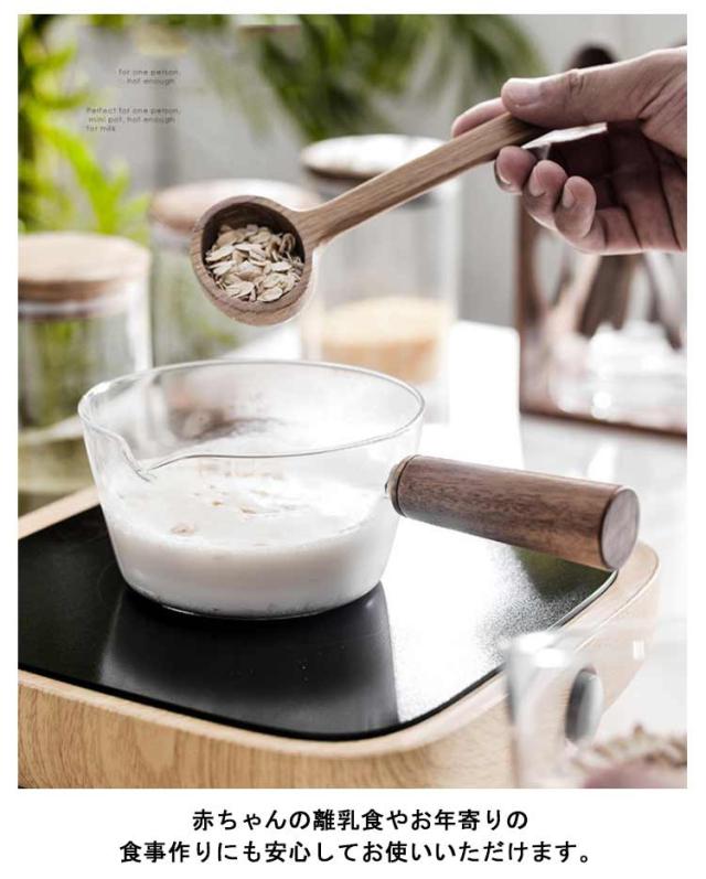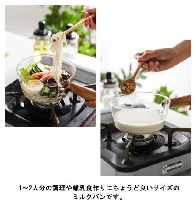 | 中身が一目で確認できるガラス製片手鍋。 1〜2人分の調理や離乳食作りにちょうど良いサイズのミルクパンです。 必要な分だけ少量で調理できるので、火力も節約できエコ調理。 一人暮らしや1〜2人分の煮物やスープつくりにぴったりのサイズです。 持ち手部分は天然木を使用、手にしっくりと馴染みます。磨きが細かく滑らかで、握り心地が快適です。 スープを煮る、ミルクを温める、お粥を作るなど、さまざまなシーンに対応! ガラス製なので雑菌が繁殖しにくく、また金属類の溶出もないので衛生的です。 赤ちゃんの離乳食やお年寄りの食事作りにも安心してお使いいただけます。 | |