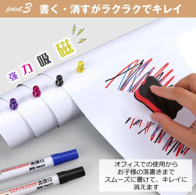 また、ホワイドボードに記入後、長時間を経ても、痕跡を残さずに綺麗に拭きやすく、使いやすい。