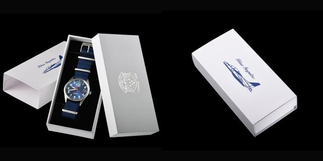 ロゴ入りの専用化粧箱でお届け。Blue Impulseのパッケージやオンでもオフでも使える腕時計の実用性により、記念品やギフトなど、大切な方への贈り物としても喜ばれます。