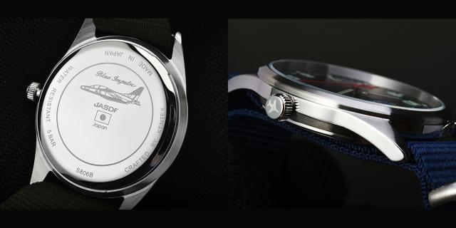 裏蓋やリューズには、ブルーインパルスの機体であるT-4のシルエットをエッチングで刻印。大好きなブルーをいつでも感じることができるデザイン。