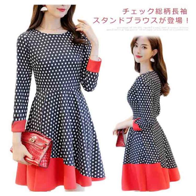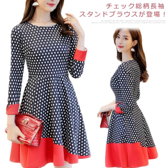ワンピース 長袖 膝丈 総柄 チェック柄 シルエット 春ワンピース Aライン OL シンプル 切り替え レディース オフィス 女子会 二次会 大きいサイズ