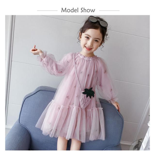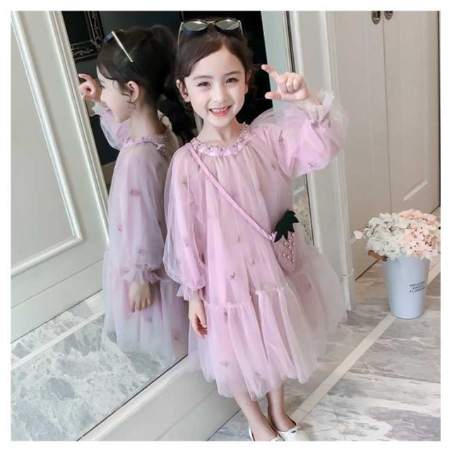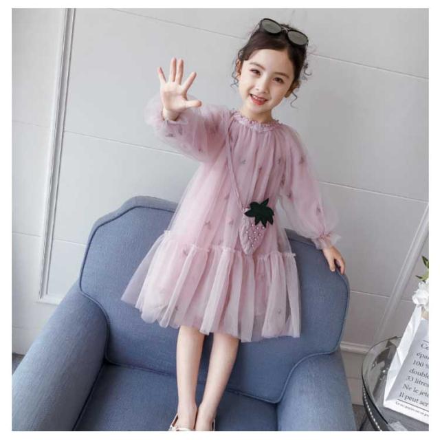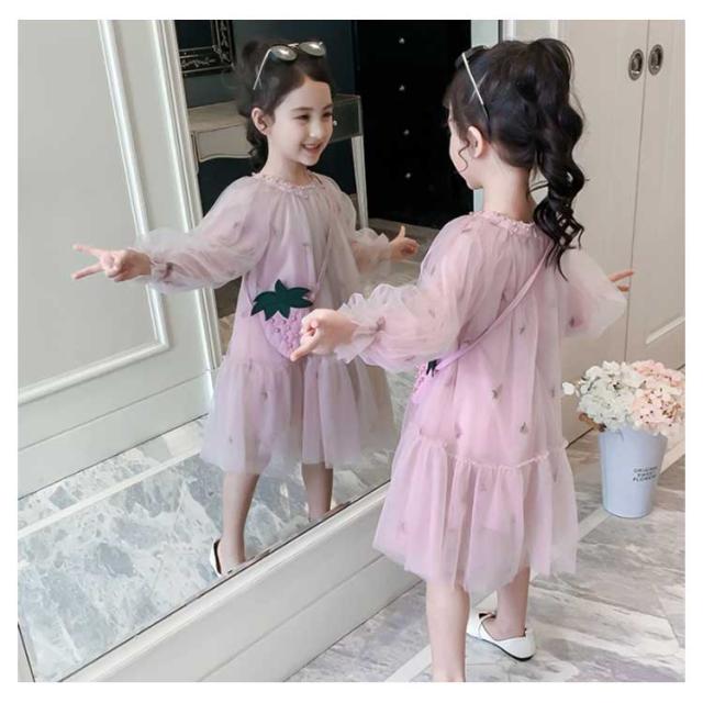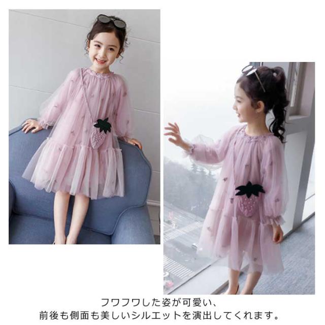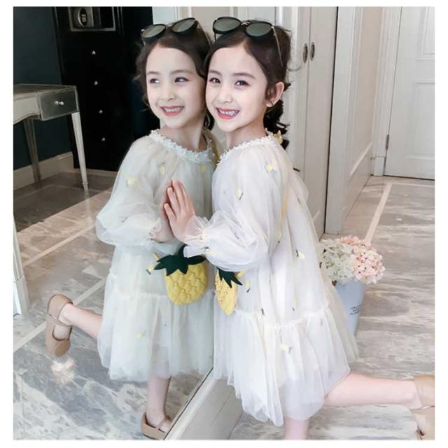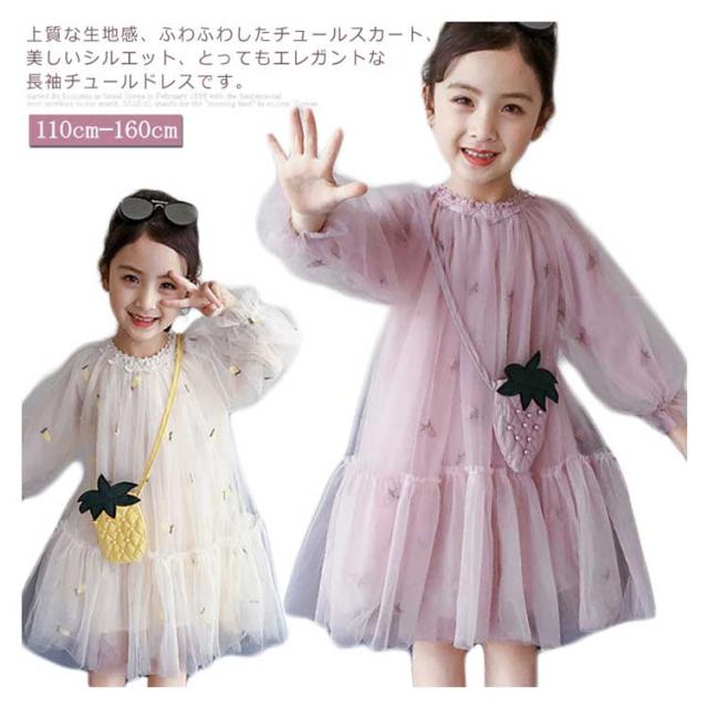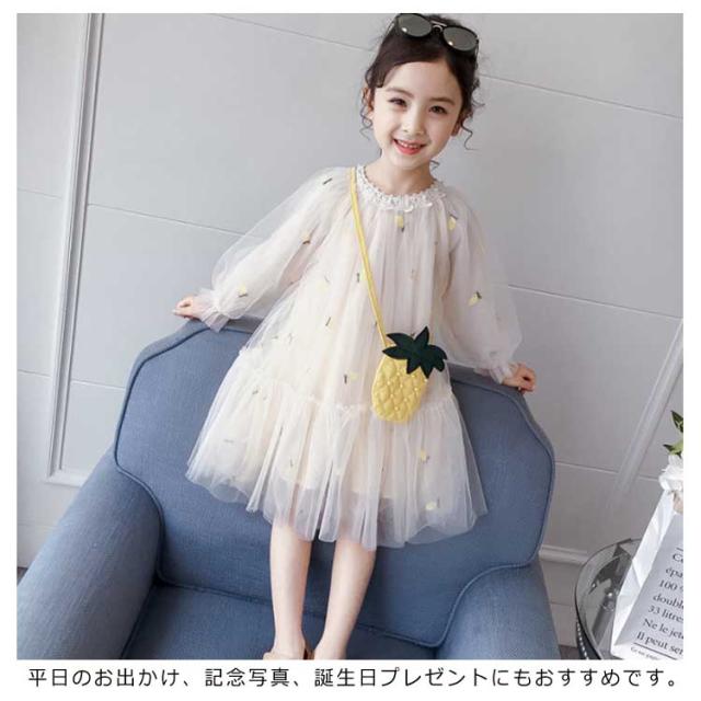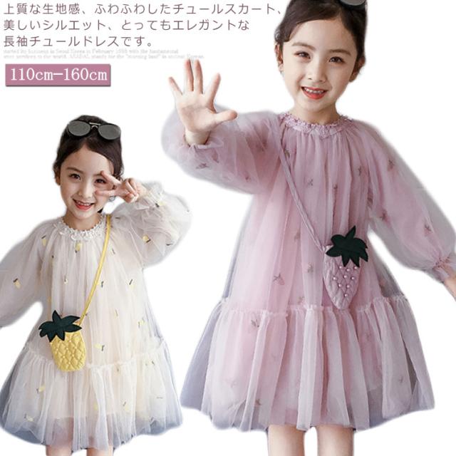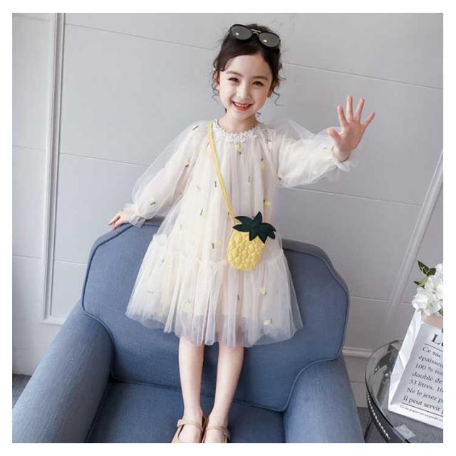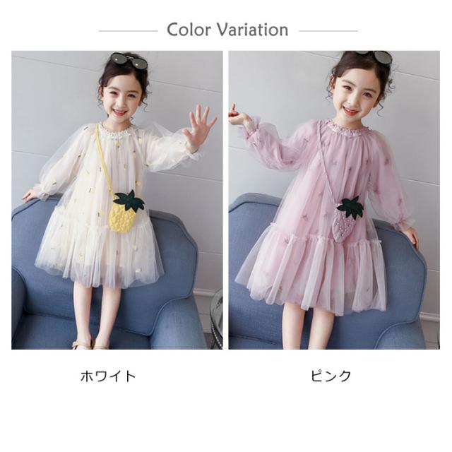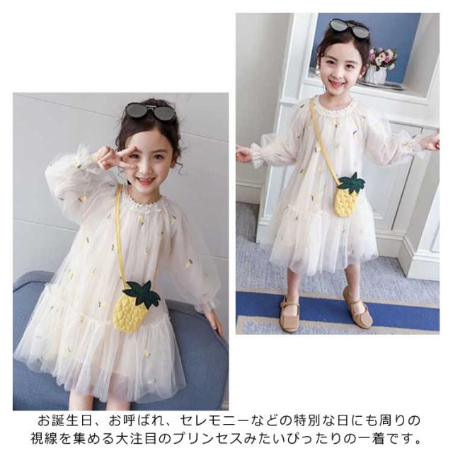 子供ワンピース チュールワンイース パイナップルショルダーバッグ付き フレアワンピース 膝丈 女の子 キッズドレス 長袖ワンピース ふんわりチュールス 可愛い プリンセス プレセント 結婚式 発表会 新作 110 120 130 140 150 160