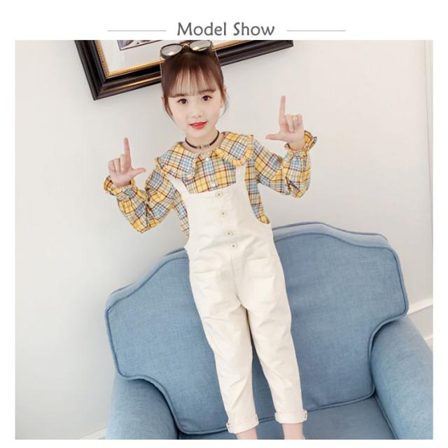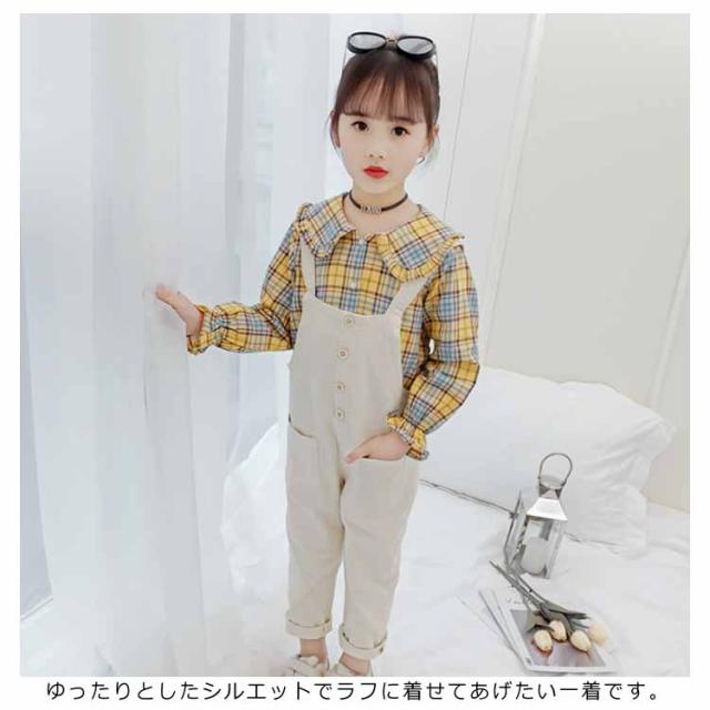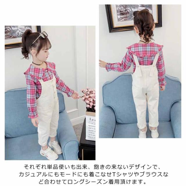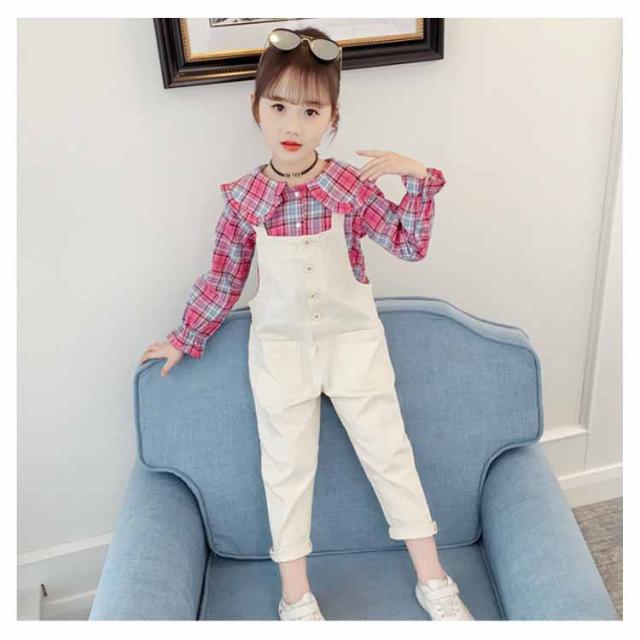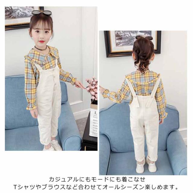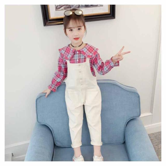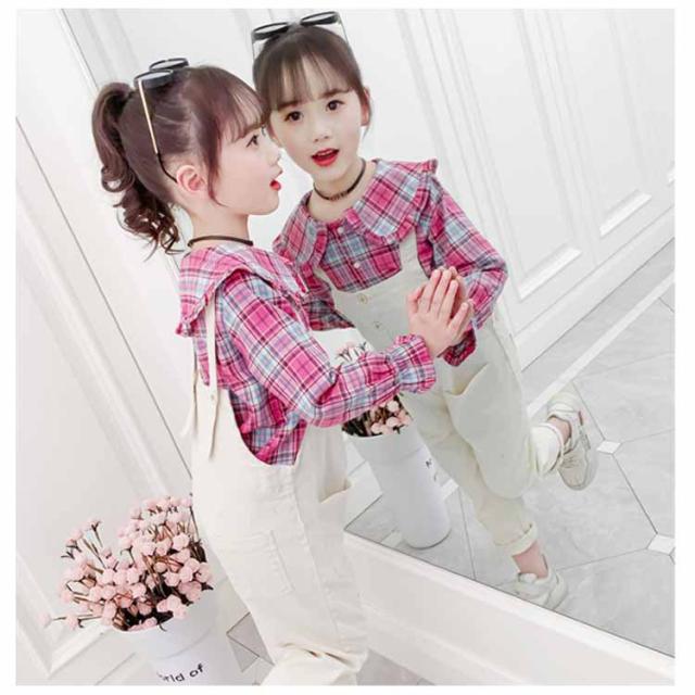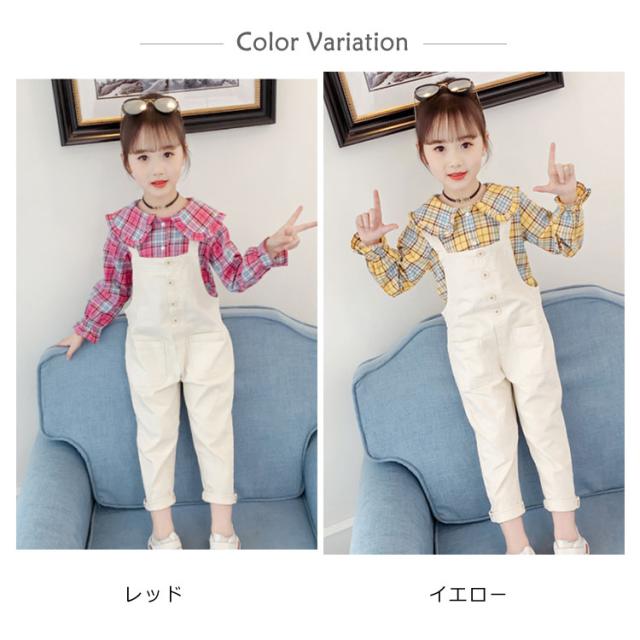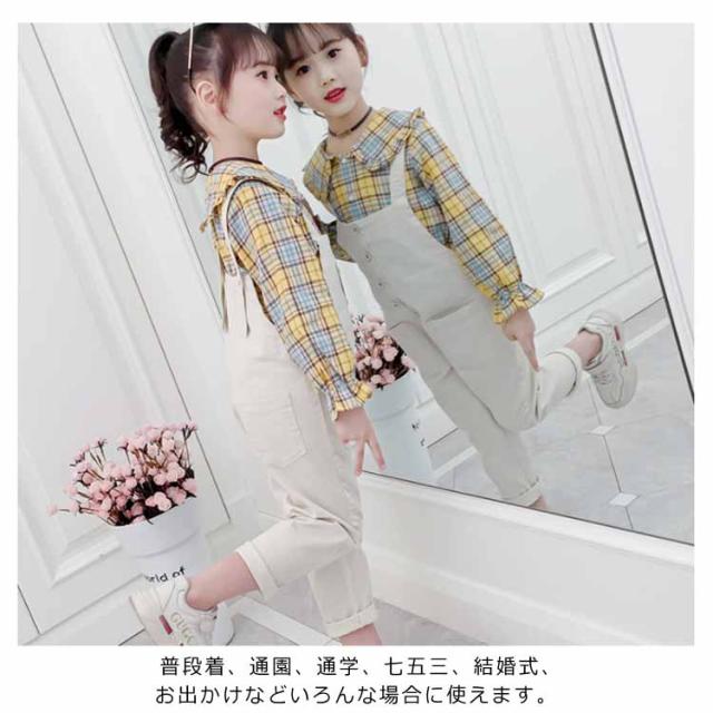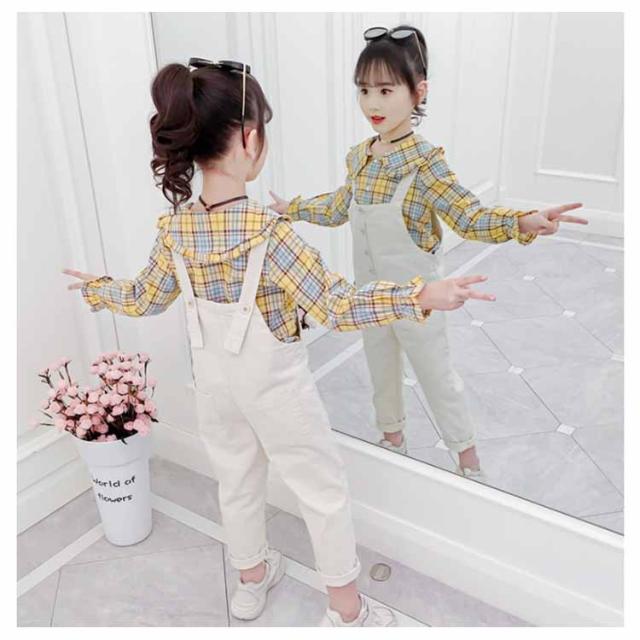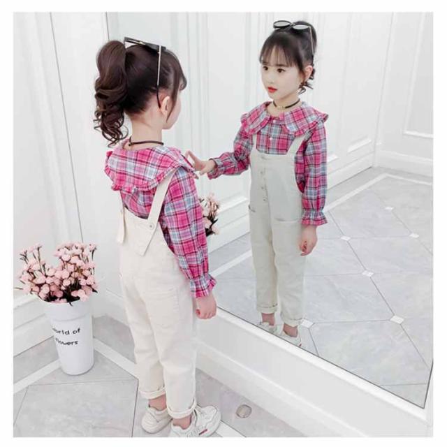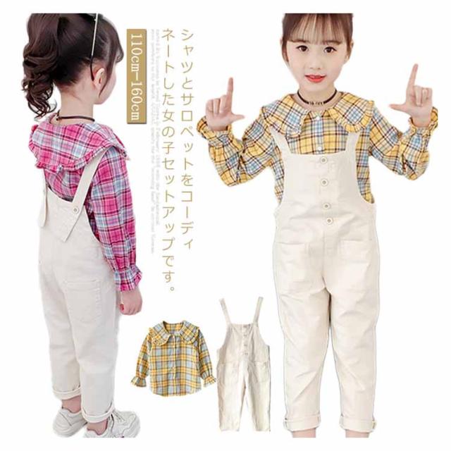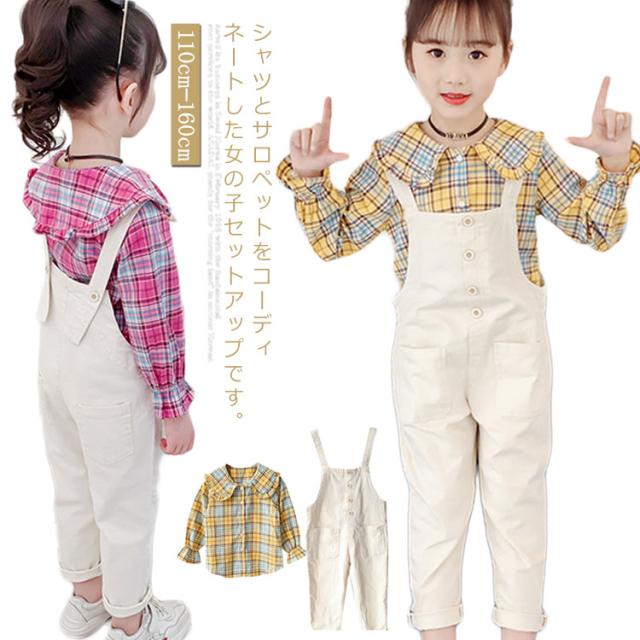 子供服 長袖シャツ サロペットパンツ 2点セット 上下セット 女の子 セットアップ チェック柄シャツ 長袖 韓国風 学院風 おしゃれ ファッション 通学 通園 写真撮影 可愛い 新作 110 120 130 140 150 160