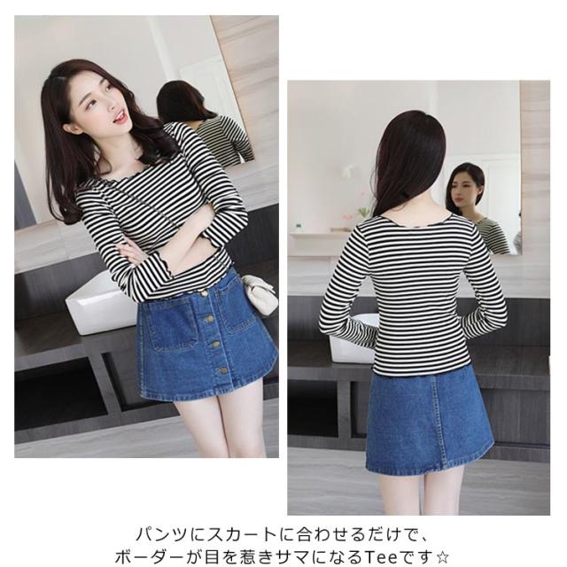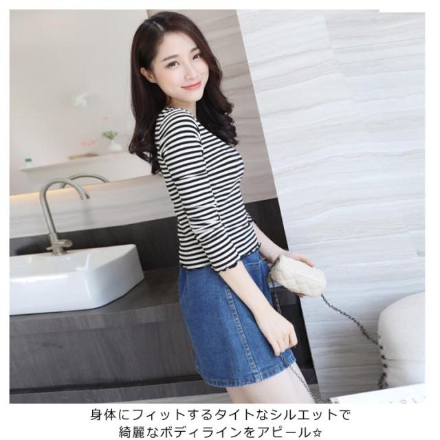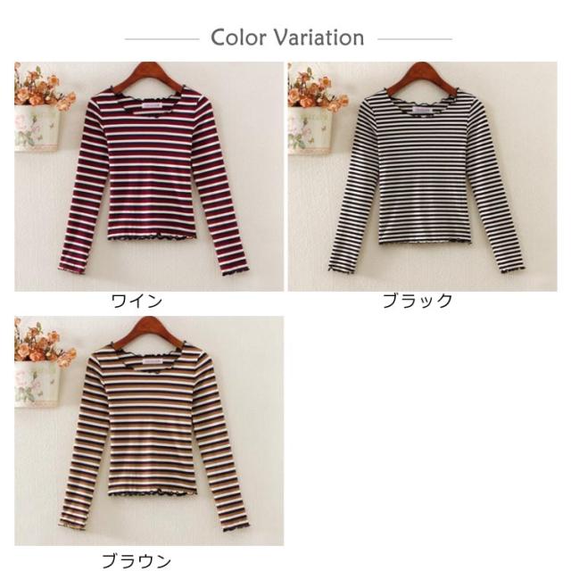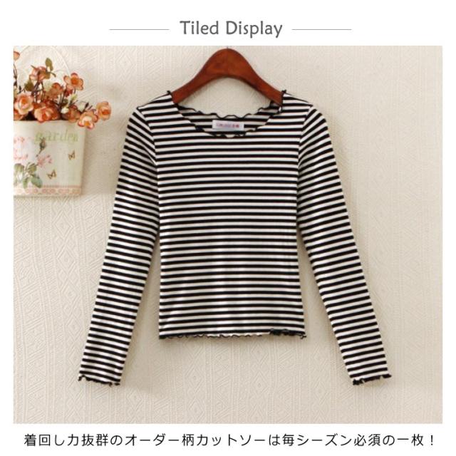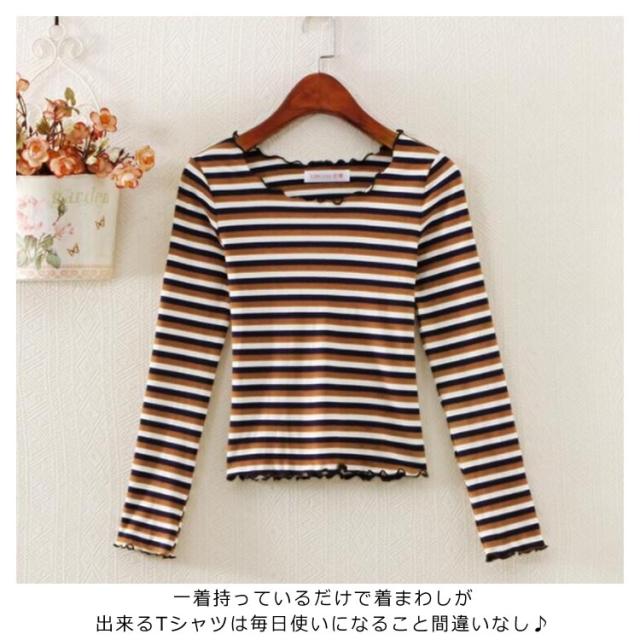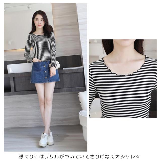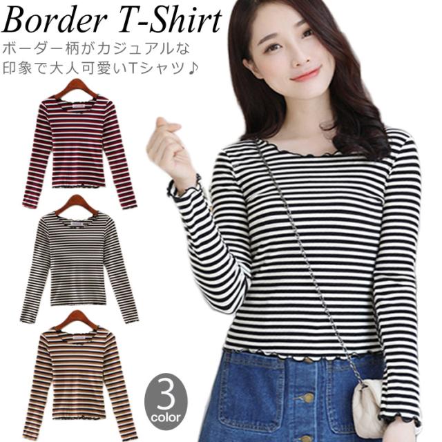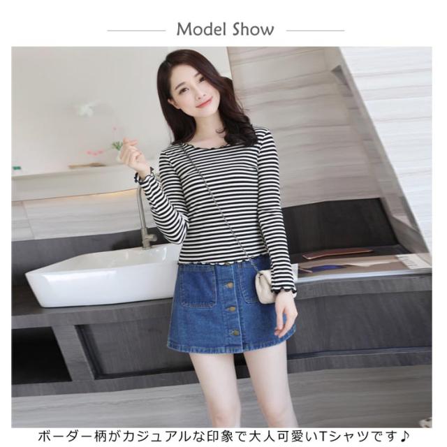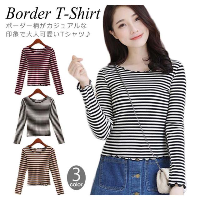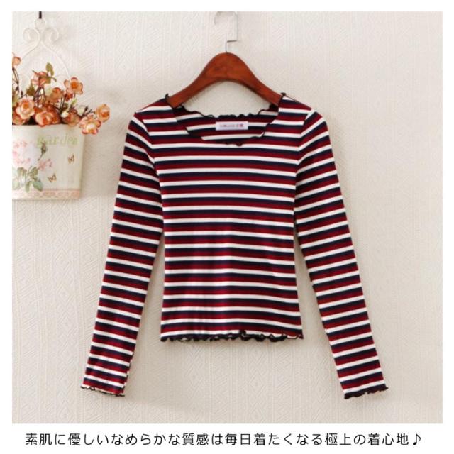 ボーダー Tシャツ ニット トップス レディース タイト クールネック 長袖 Tシャツ フリル襟 ボーダー柄 カットソー マリン風 tシャツ