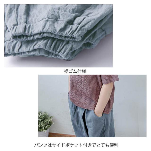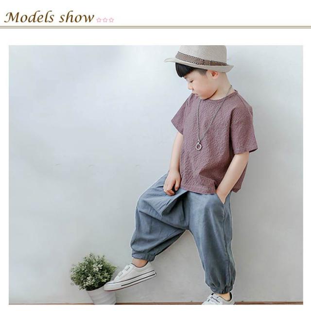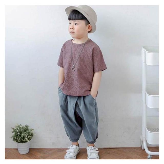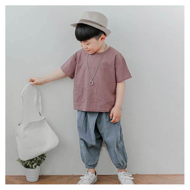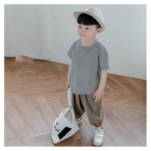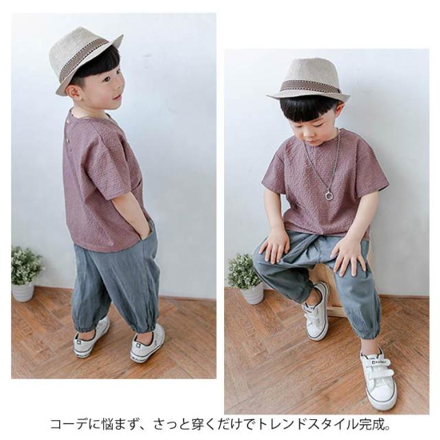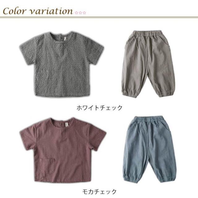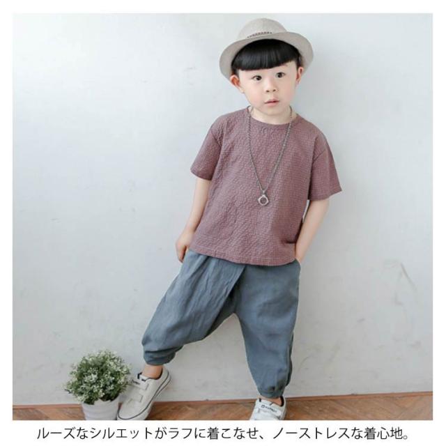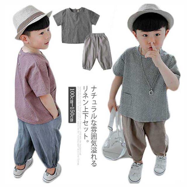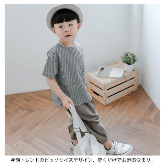 送料無料 リネン セットアップ 男の子 半袖トップス サルエルパンツ キッズ 綿麻 チェック柄 半袖 シャツ プルオーバー ブルー サルエルパンツ 2点セット 上下セット 夏 涼しい ゆったり ジョガーパンツ イージーパンツ ガウチョパンツ ナチュラル