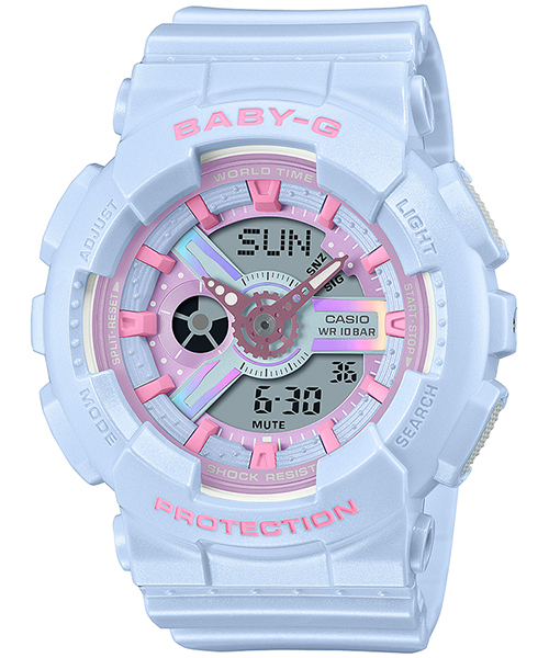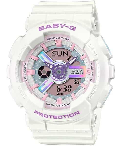 BA-110FHはパーツに偏光塗装やホログラムの加工を施し、ケースとバンドには光沢感のあるパール塗装を施しました。BGA-320FHはインデックスと文字板に偏光塗装を施しました。角度によって微妙に色彩が変わるギミックとなっています。
