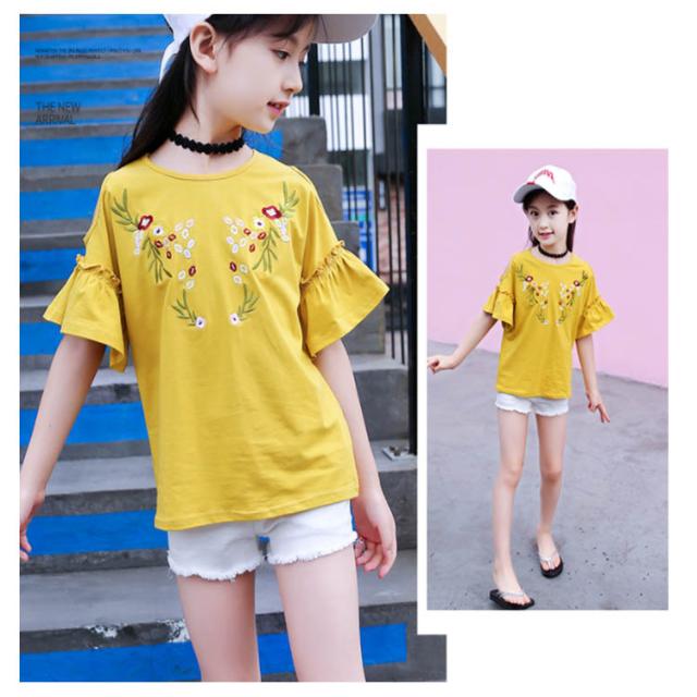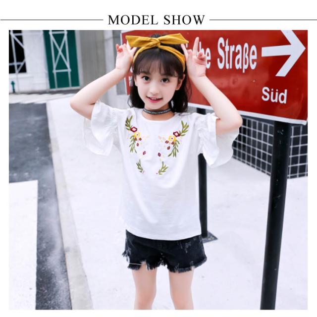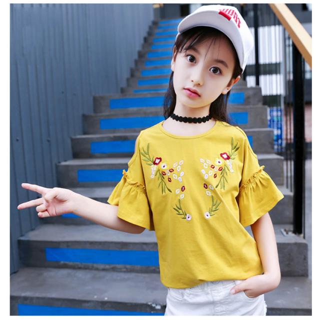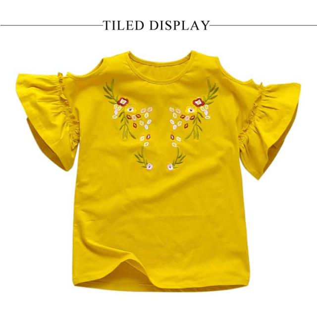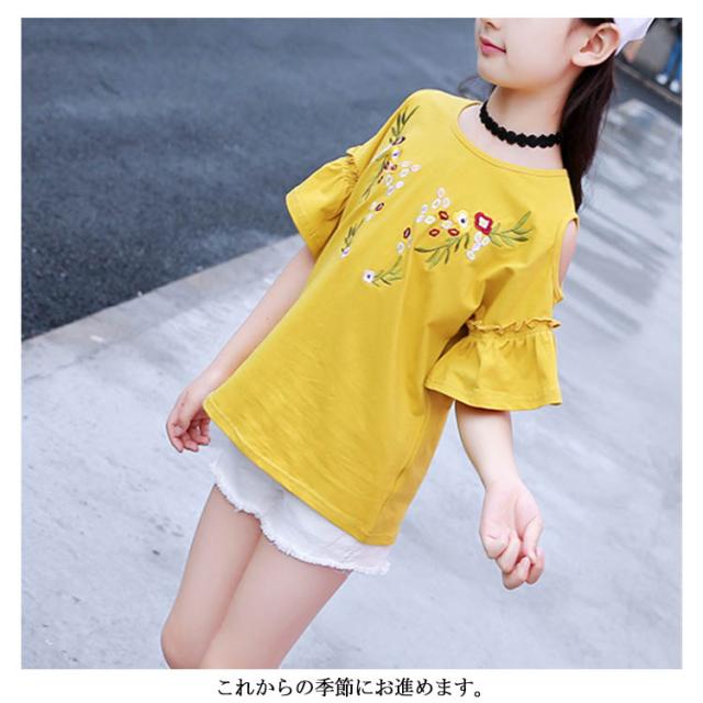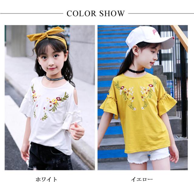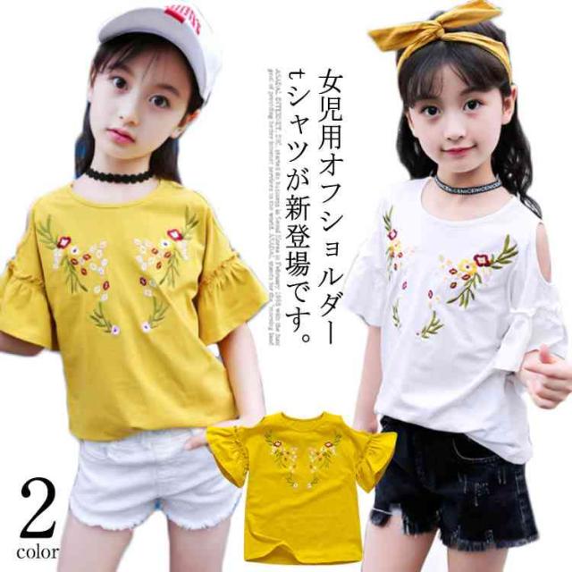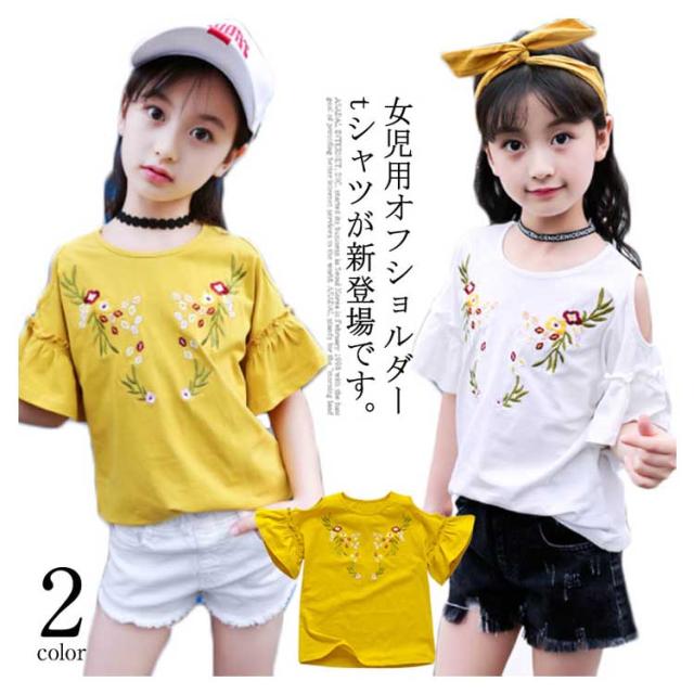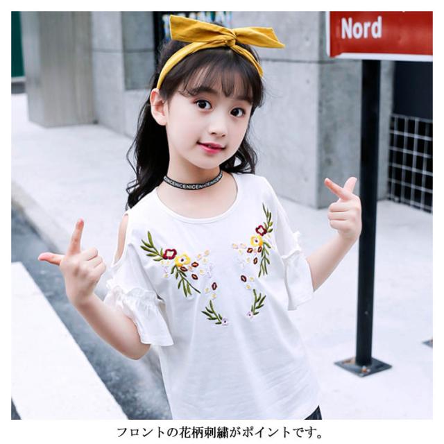 子供服 オフショルダーTシャツ 肩出しシャツ トップス 花柄刺繍 クルーネック 半袖 女の子 ゆったり 女児 キッズ 韓国子供服 カットソー 可愛い 夏新作 110 120 130 140 150 160