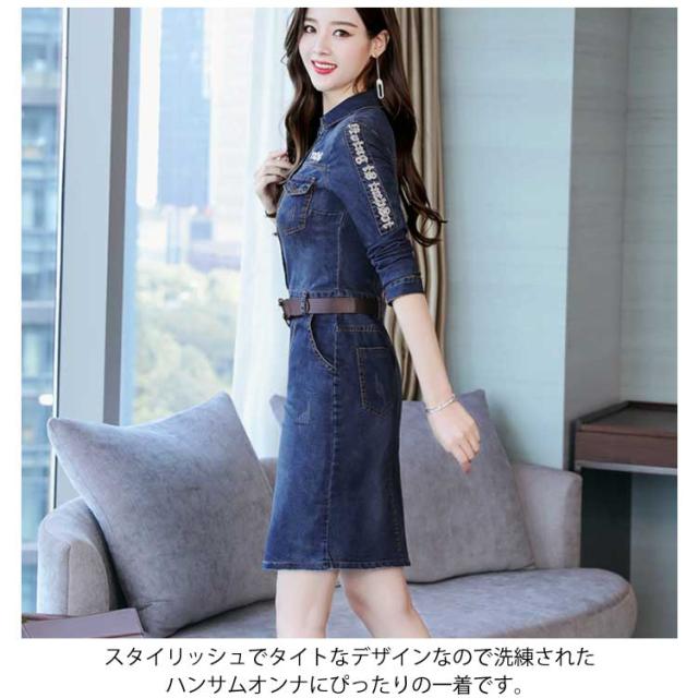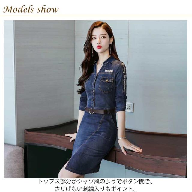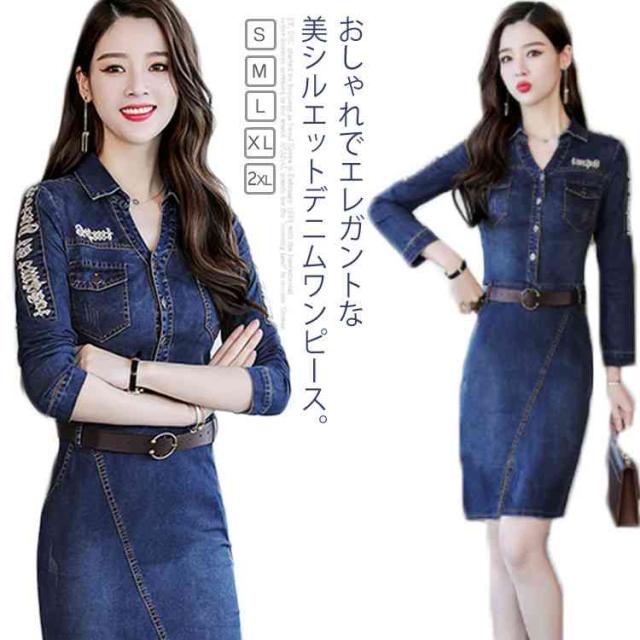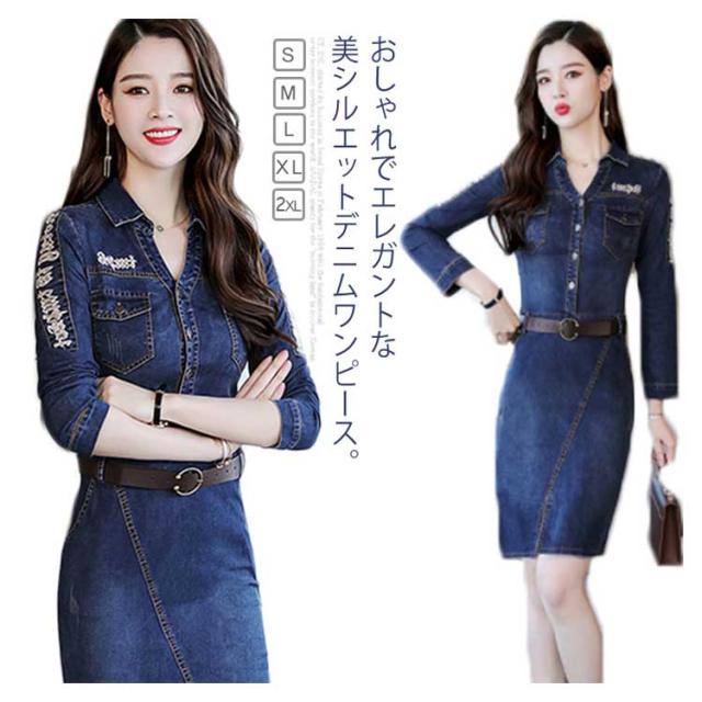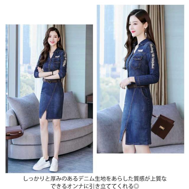 フロント斜めステッチ×スリット入り!ワンピース デニムワンピース タイト 膝丈 デニムワンピ 長袖 タイトワンピース 刺繍入り 春 秋 おしゃれ送料無料