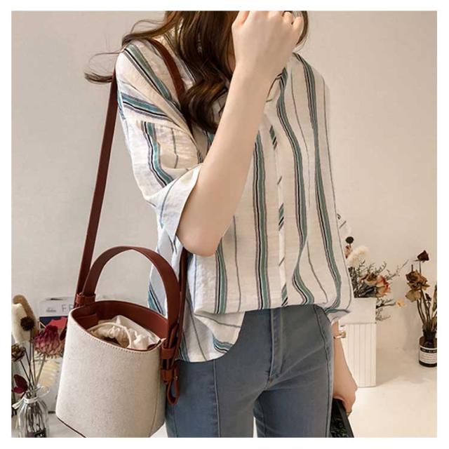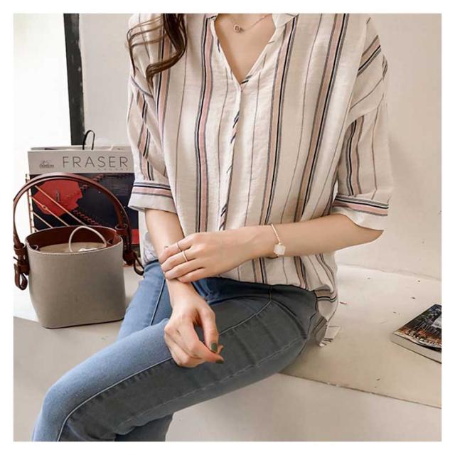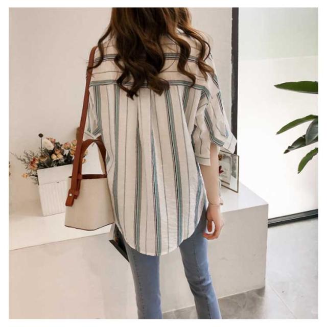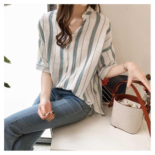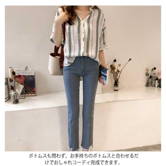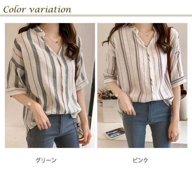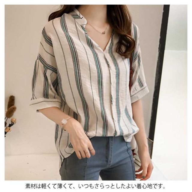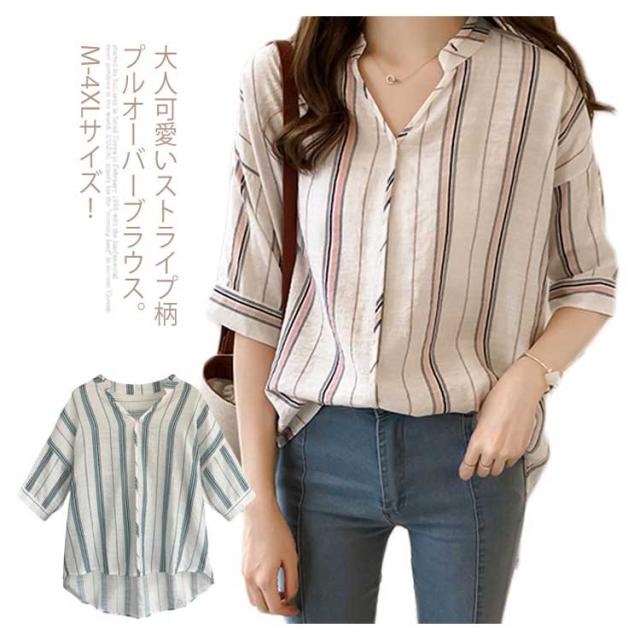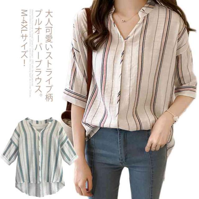 M-4XLサイズ!シャツ レディース 5分袖 トップス ブラウス ストライプ スキッパーシャツ ぷるオーバ0 トップス おしゃれ 可愛い 春 夏送料無料
