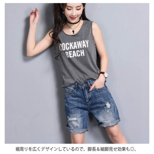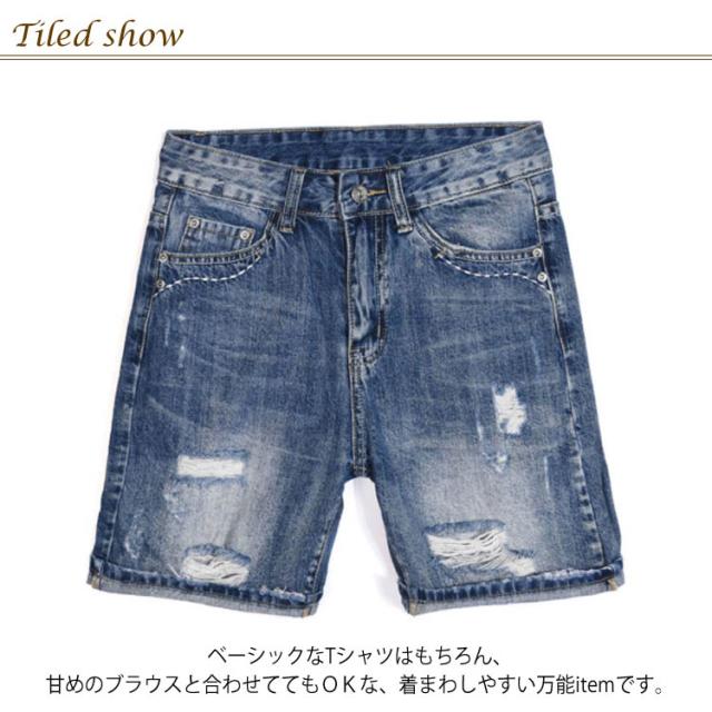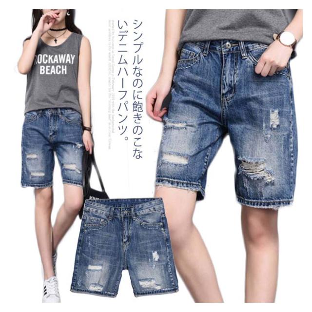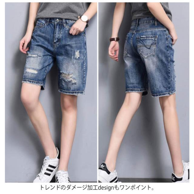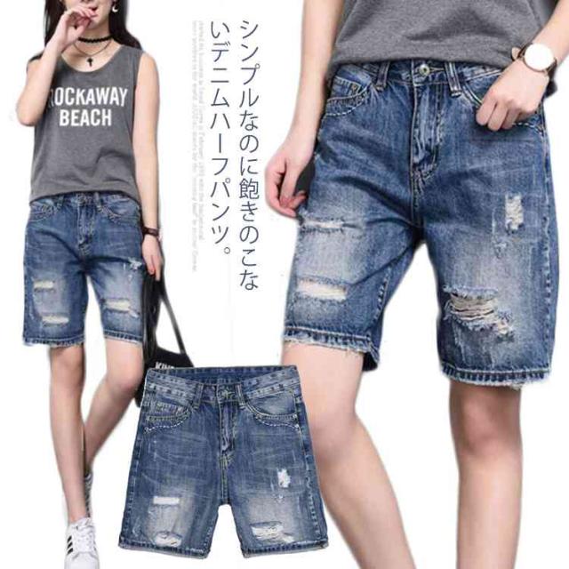美シルエットで細見せ効果アリ!デニムハーフパンツ デニムパンツ 五分丈 ハーフパンツ デニム ジーンズ ボトムス ダメージ クラッシュ ゆったり ハイウエスト 夏 レディース
