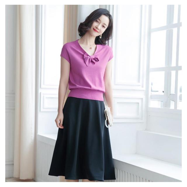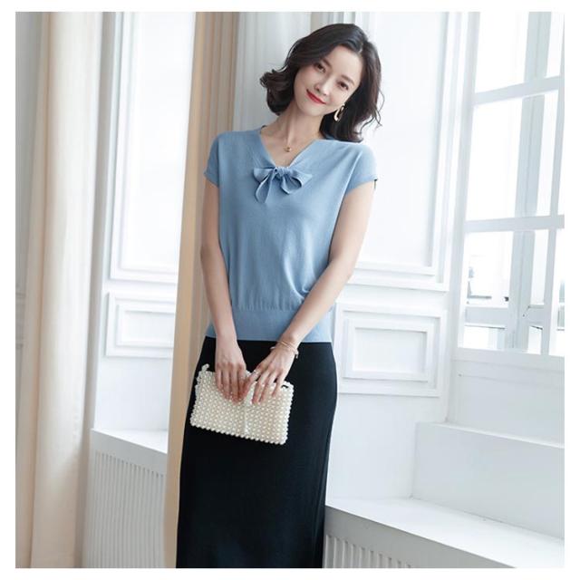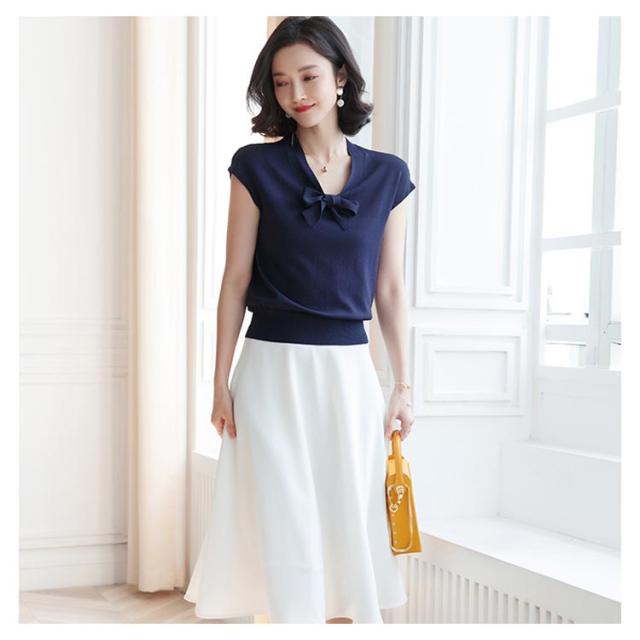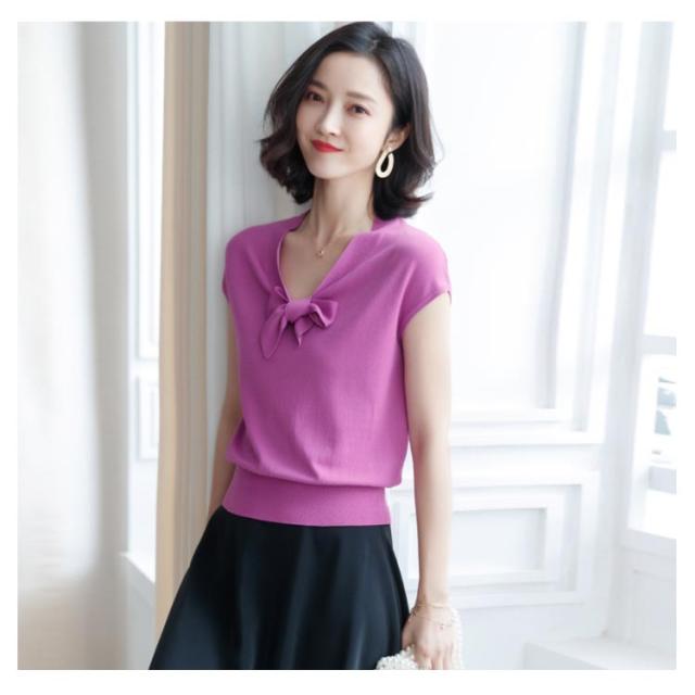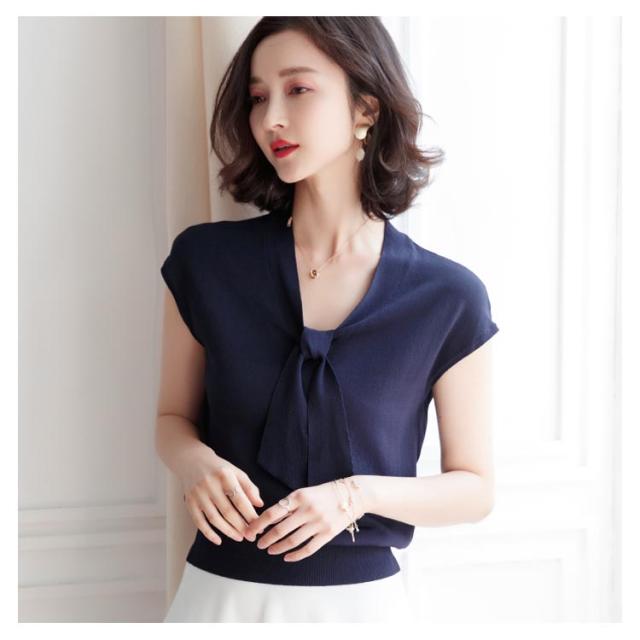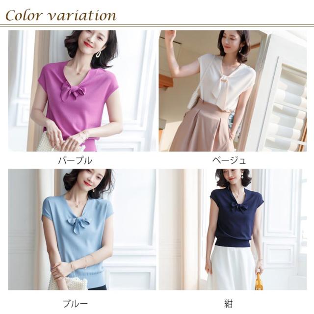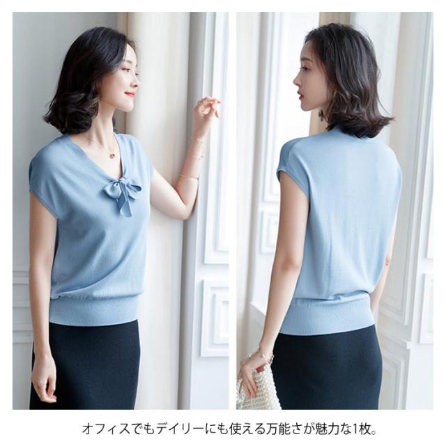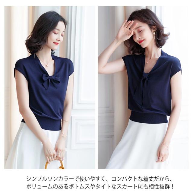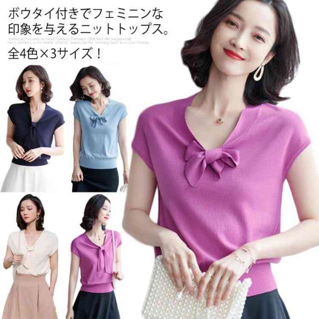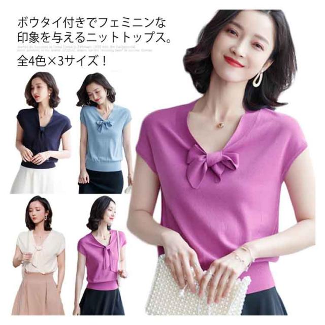 全4色×3サイズ!サマーニット レディース ニットトップス 半袖ニット Vネック ニット トップス サマー 薄手 リボン付き 大人 上品 夏 シンプル 無地送料無料