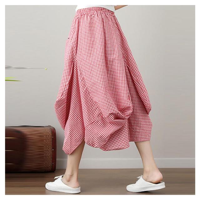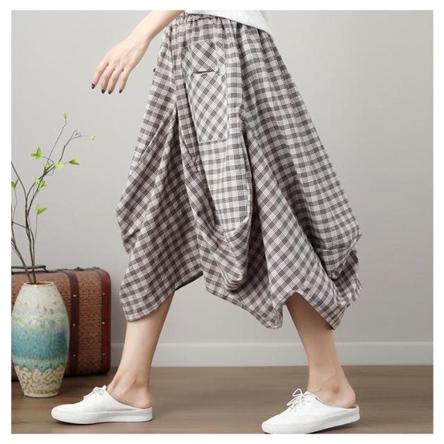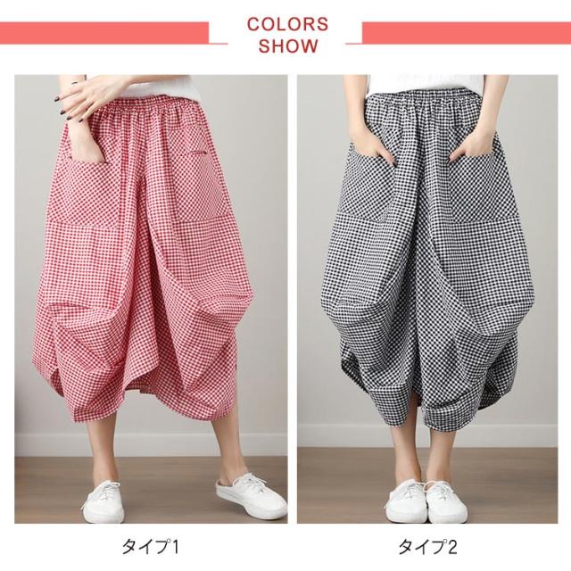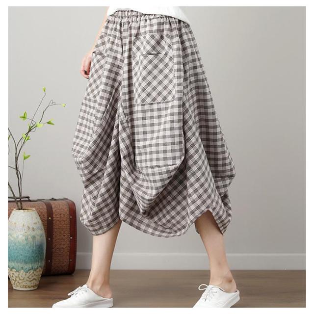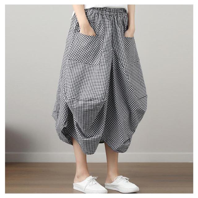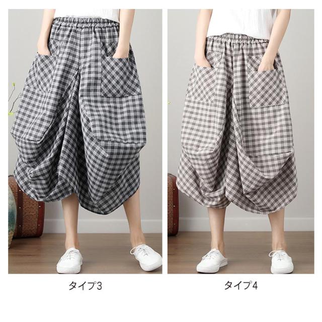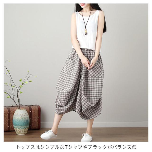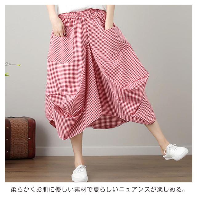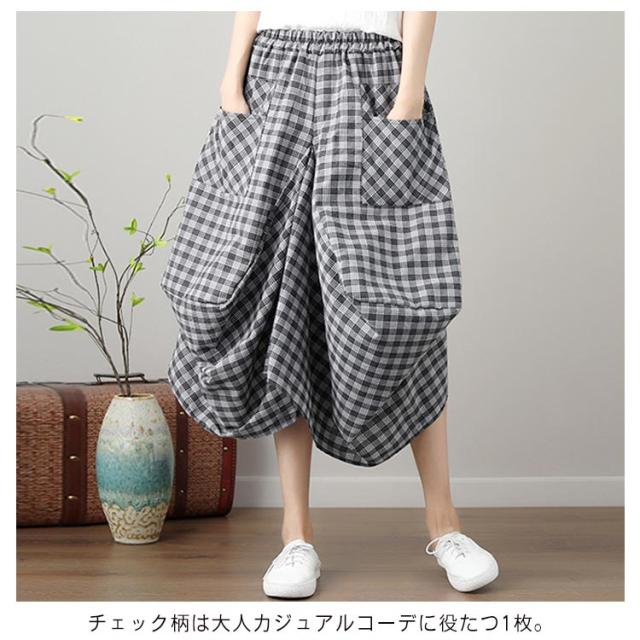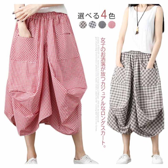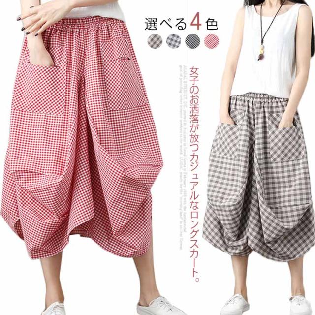 ロングスカート チェック柄 レディース スカート 麻綿 ナチュラル 体型カバー ワイドスカート ボトムス マキシ丈 ゆったり カジュアル お洒落 ウエストゴム送料無料